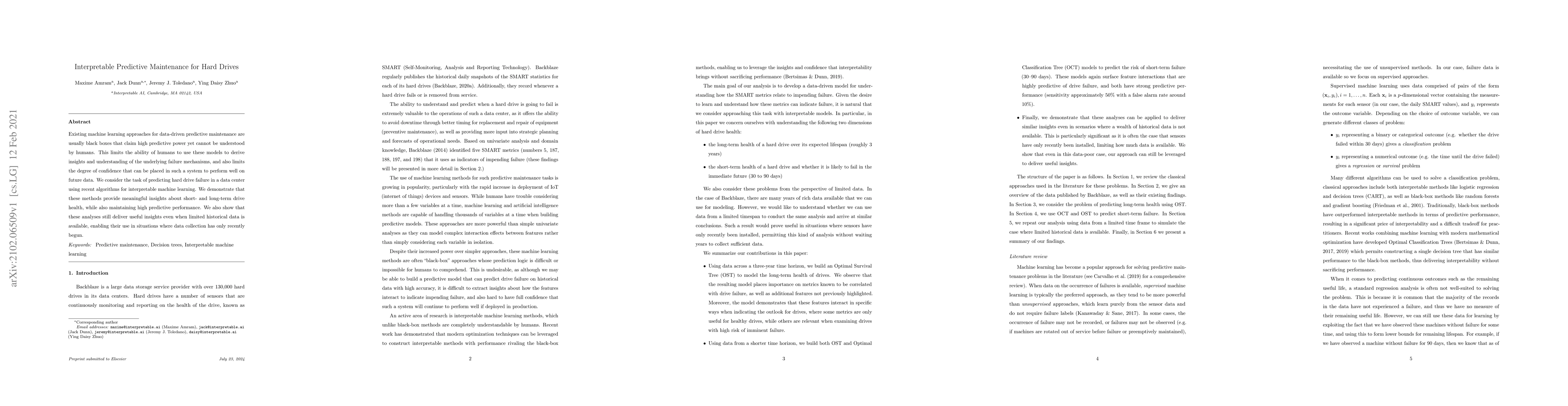 Existing machine learning approaches for data-driven predictive maintenance are usually black boxes that claim high predictive power yet cannot be understood by humans. This limits the ability of humans to use these models to derive insights and understanding of the underlying failure mechanisms, and also limits the degree of confidence that can be placed in such a system to perform well on future data. We consider the task of predicting hard drive failure in a data center using recent algorithms for interpretable machine learning. We demonstrate that these methods provide meaningful insights about short- and long-term drive health, while also maintaining high predictive performance. We also show that these analyses still deliver useful insights even when limited historical data is available, enabling their use in situations where data collection has only recently begun.