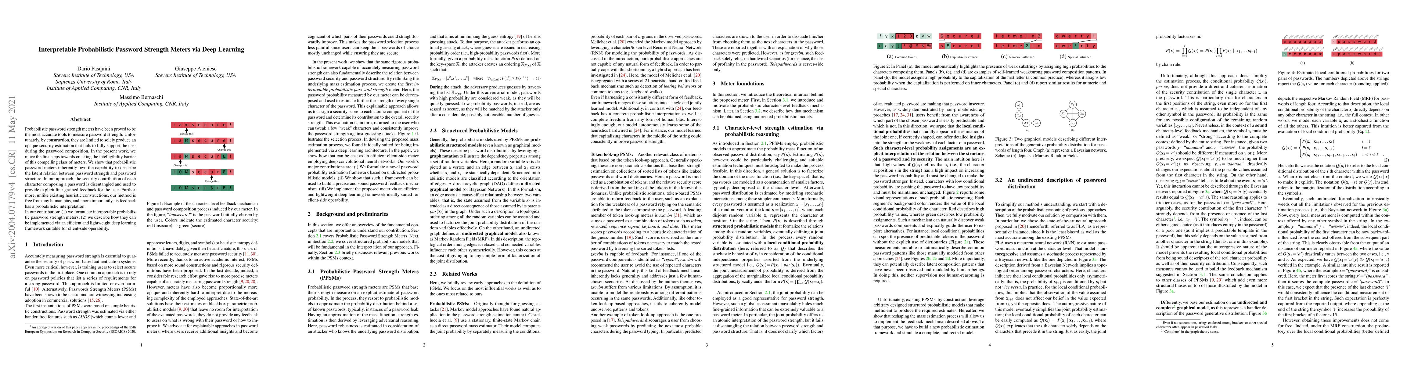 This paper proposes interpretable probabilistic password strength meters that provide fine-grained feedback to users on the security contribution of each character in a password. The method uses a deep learning framework to disentangle the relationship between password strength and structure, offering a probabilistic interpretation free from human bias.