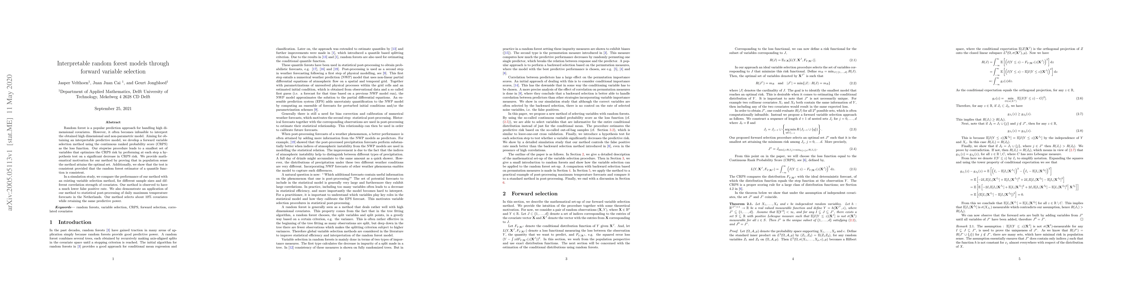 This paper develops a forward variable selection method for interpretable random forest models using the continuous ranked probability score as the loss function. The method selects a minimal set of variables that optimize predictive performance while maintaining interpretability, demonstrating lower false positive rates in simulations and effective application in temperature forecast post-processing.