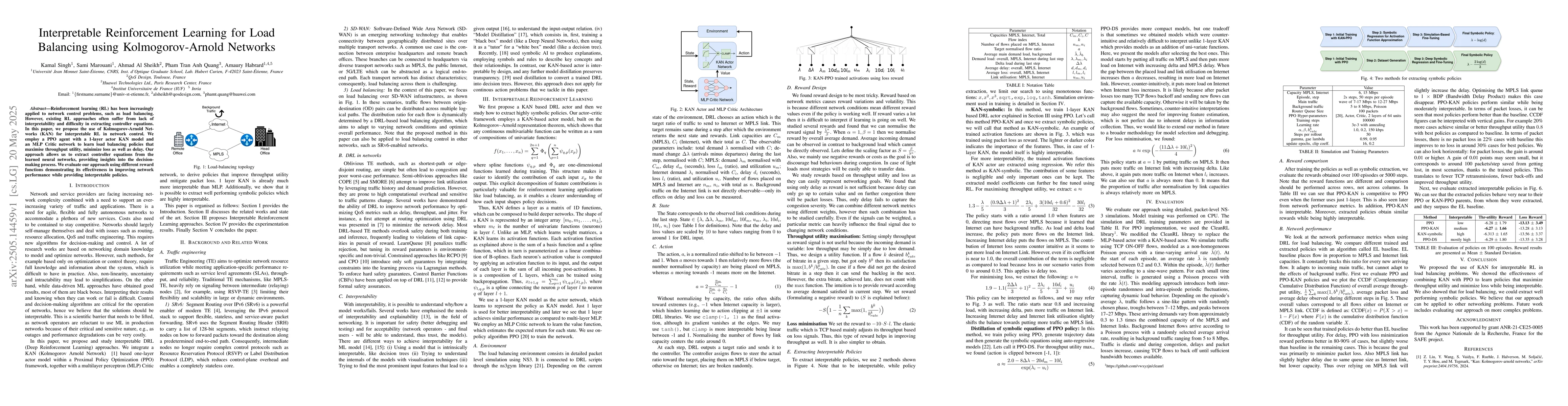 This work is novel by focusing on interpretability in RL for load balancing, using KANs to provide insights into the decision-making process, which is a distinctive approach compared to existing RL methods that often lack such transparency.