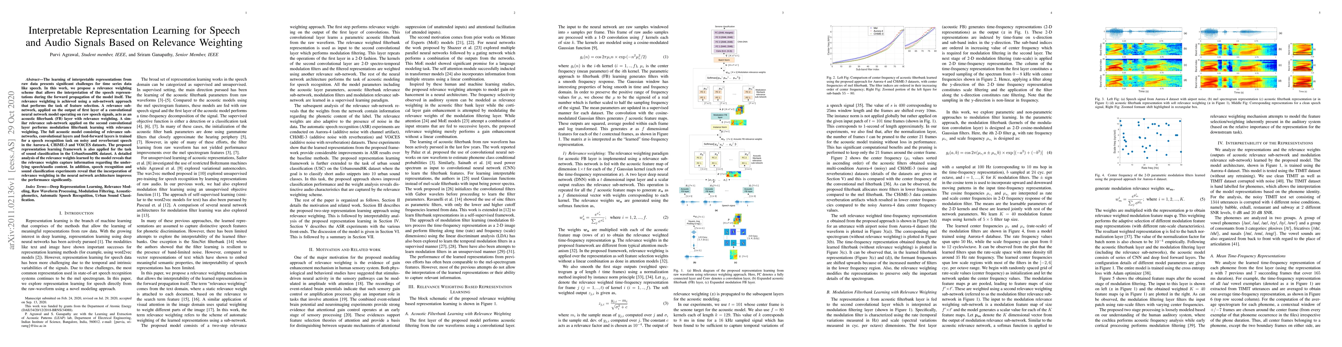 The learning of interpretable representations from raw data presents significant challenges for time series data like speech. In this work, we propose a relevance weighting scheme that allows the interpretation of the speech representations during the forward propagation of the model itself. The relevance weighting is achieved using a sub-network approach that performs the task of feature selection. A relevance sub-network, applied on the output of first layer of a convolutional neural network model operating on raw speech signals, acts as an acoustic filterbank (FB) layer with relevance weighting. A similar relevance sub-network applied on the second convolutional layer performs modulation filterbank learning with relevance weighting. The full acoustic model consisting of relevance sub-networks, convolutional layers and feed-forward layers is trained for a speech recognition task on noisy and reverberant speech in the Aurora-4, CHiME-3 and VOiCES datasets. The proposed representation learning framework is also applied for the task of sound classification in the UrbanSound8K dataset. A detailed analysis of the relevance weights learned by the model reveals that the relevance weights capture information regarding the underlying speech/audio content. In addition, speech recognition and sound classification experiments reveal that the incorporation of relevance weighting in the neural network architecture improves the performance significantly.