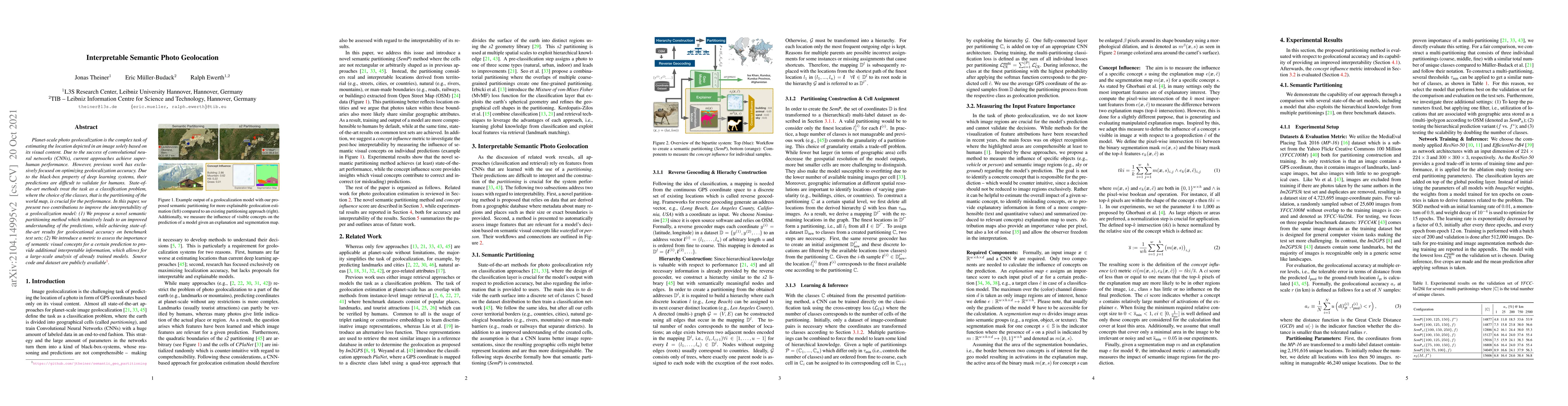 Planet-scale photo geolocalization is the complex task of estimating the location depicted in an image solely based on its visual content. Due to the success of convolutional neural networks (CNNs), current approaches achieve super-human performance. However, previous work has exclusively focused on optimizing geolocalization accuracy. Due to the black-box property of deep learning systems, their predictions are difficult to validate for humans. State-of-the-art methods treat the task as a classification problem, where the choice of the classes, that is the partitioning of the world map, is crucial for the performance. In this paper, we present two contributions to improve the interpretability of a geolocalization model: (1) We propose a novel semantic partitioning method which intuitively leads to an improved understanding of the predictions, while achieving state-of-the-art results for geolocational accuracy on benchmark test sets; (2) We introduce a metric to assess the importance of semantic visual concepts for a certain prediction to provide additional interpretable information, which allows for a large-scale analysis of already trained models. Source code and dataset are publicly available.
