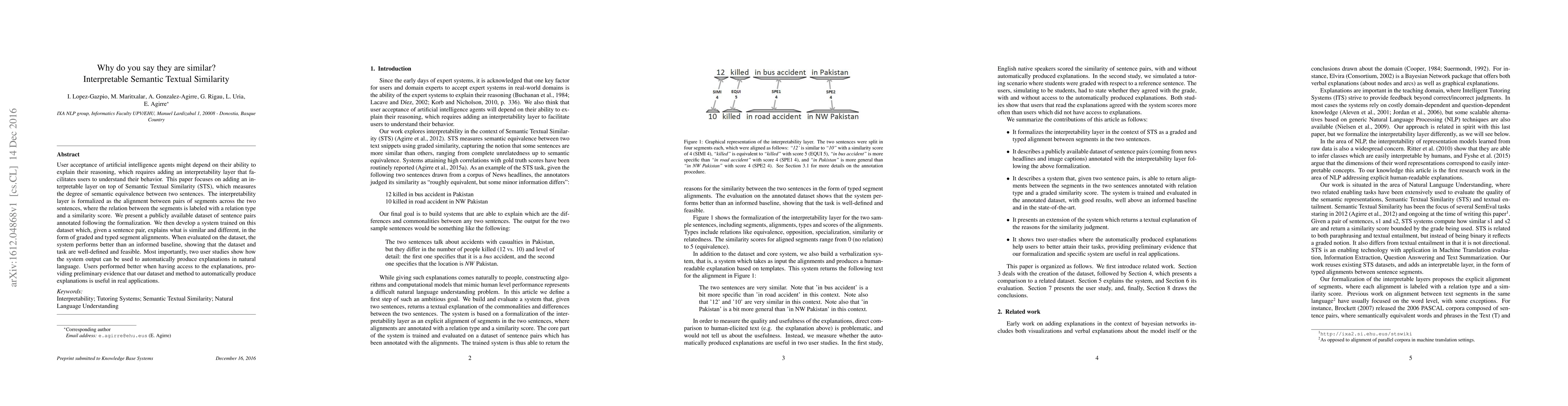 User acceptance of artificial intelligence agents might depend on their ability to explain their reasoning, which requires adding an interpretability layer that fa- cilitates users to understand their behavior. This paper focuses on adding an in- terpretable layer on top of Semantic Textual Similarity (STS), which measures the degree of semantic equivalence between two sentences. The interpretability layer is formalized as the alignment between pairs of segments across the two sentences, where the relation between the segments is labeled with a relation type and a similarity score. We present a publicly available dataset of sentence pairs annotated following the formalization. We then develop a system trained on this dataset which, given a sentence pair, explains what is similar and different, in the form of graded and typed segment alignments. When evaluated on the dataset, the system performs better than an informed baseline, showing that the dataset and task are well-defined and feasible. Most importantly, two user studies show how the system output can be used to automatically produce explanations in natural language. Users performed better when having access to the explanations, pro- viding preliminary evidence that our dataset and method to automatically produce explanations is useful in real applications.