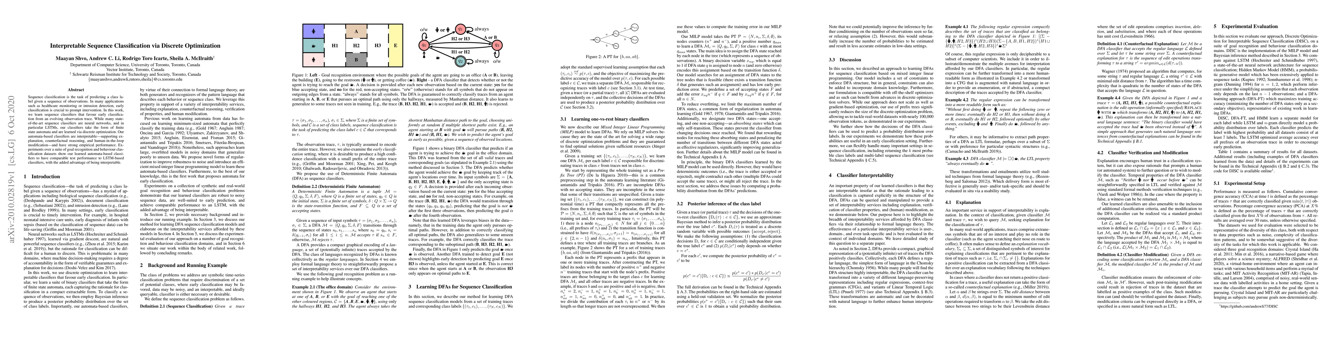 This paper proposes interpretable sequence classifiers based on finite state automata learned via discrete optimization, demonstrating comparable performance to LSTM-based classifiers while offering advantages in interpretability, explanation, and human-in-the-loop modifications. Experiments on various datasets confirm the effectiveness of these automata-based classifiers.