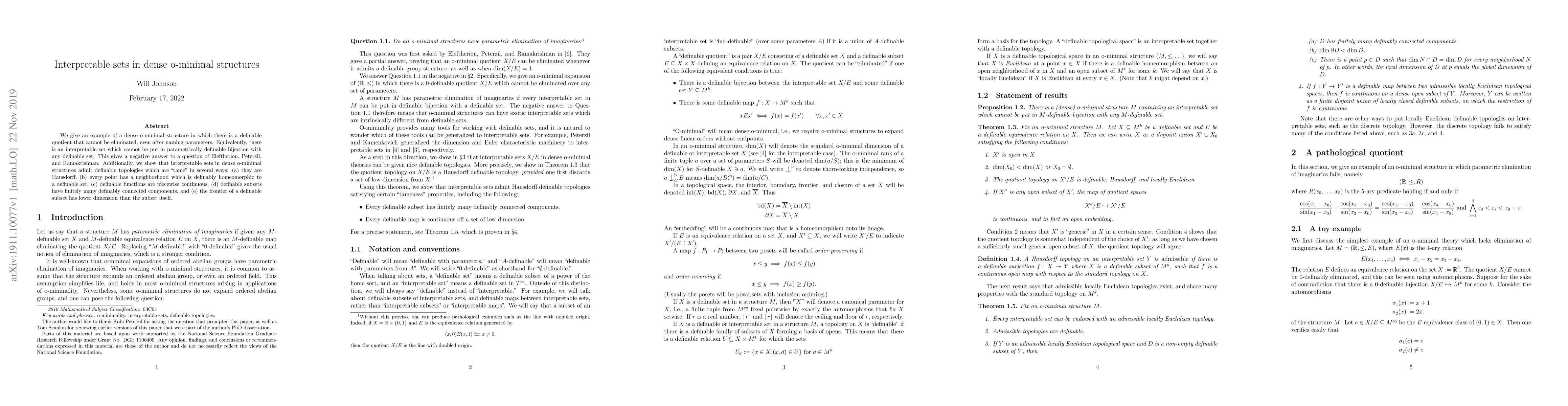This paper presents an example of a dense o-minimal structure where a definable quotient cannot be eliminated, answering a question negatively regarding interpretable sets. It also demonstrates that interpretable sets in such structures possess tame definable topologies characterized by Hausdorff properties, local definability, piecewise continuity, finite connected components, and lower-dimensional frontiers.