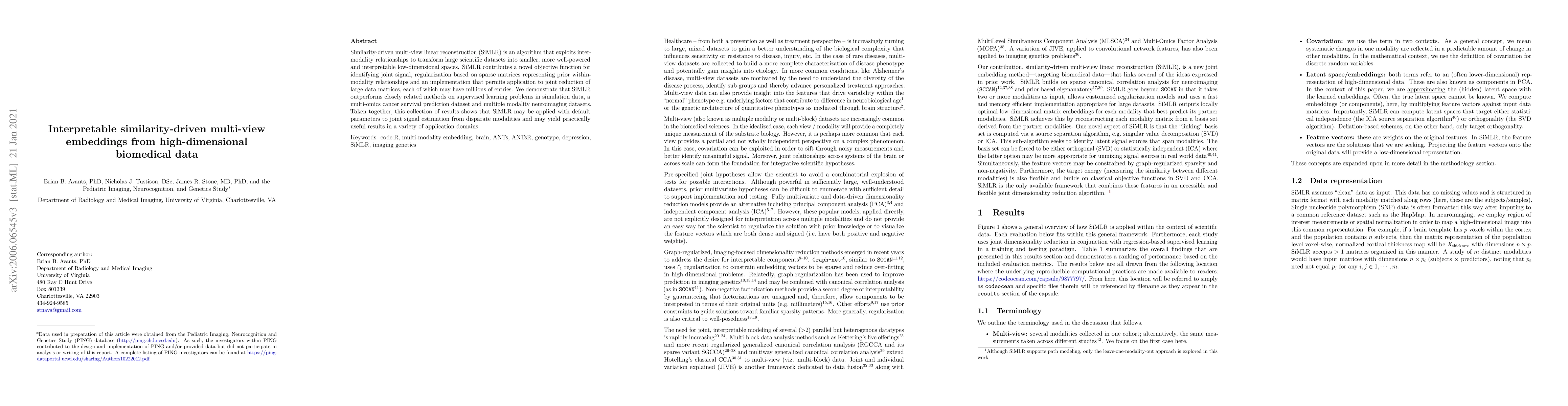 The paper introduces SiMLR, an algorithm that transforms large biomedical datasets into smaller, interpretable low-dimensional spaces by leveraging relationships between different data types. SiMLR outperforms similar methods in simulations, cancer survival prediction, and neuroimaging datasets, suggesting its broad applicability for joint signal estimation from diverse data sources.