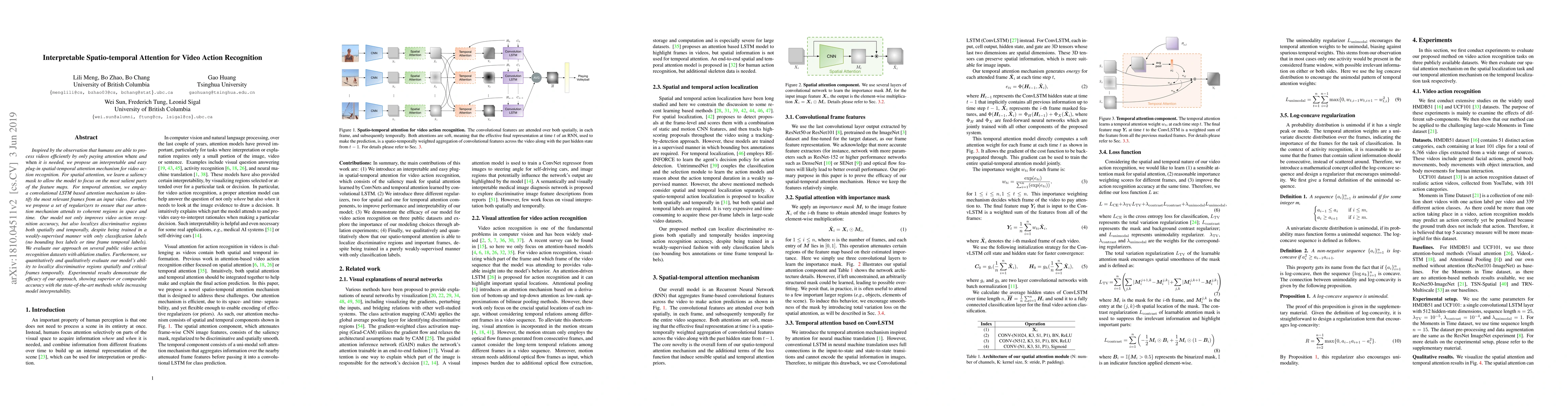 This paper proposes an interpretable spatial-temporal attention mechanism for video action recognition, utilizing saliency masks for spatial focus and a convolutional LSTM for temporal relevance. The method improves accuracy and localizes key regions and frames, demonstrating competitive performance against state-of-the-art while enhancing model interpretability.