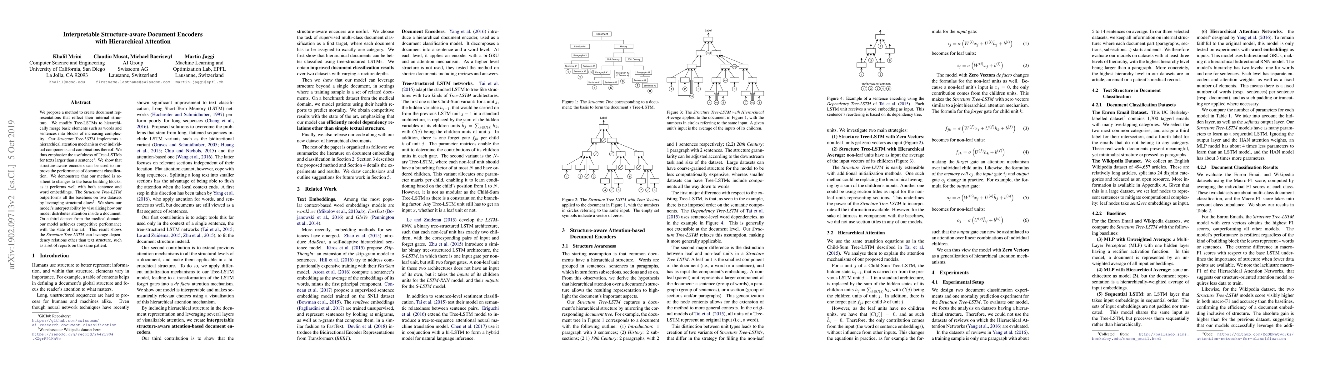 This paper proposes a novel Structure Tree-LSTM method that hierarchically merges text elements to create interpretable document representations, emphasizing structural clues for improved document classification. The model outperforms baselines and demonstrates resilience and competitive performance across different datasets.