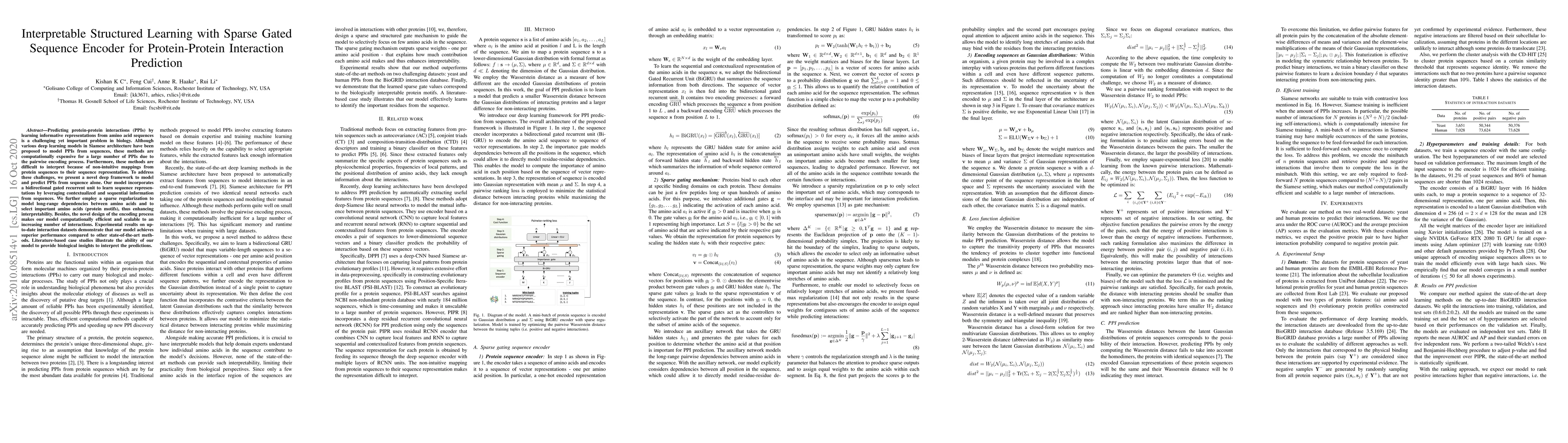This paper proposes a novel deep learning framework using a sparse gated sequence encoder to predict protein-protein interactions efficiently and interpretably. The model leverages bidirectional gated recurrent units and sparse regularization to enhance scalability and biological insights, outperforming existing methods in performance.