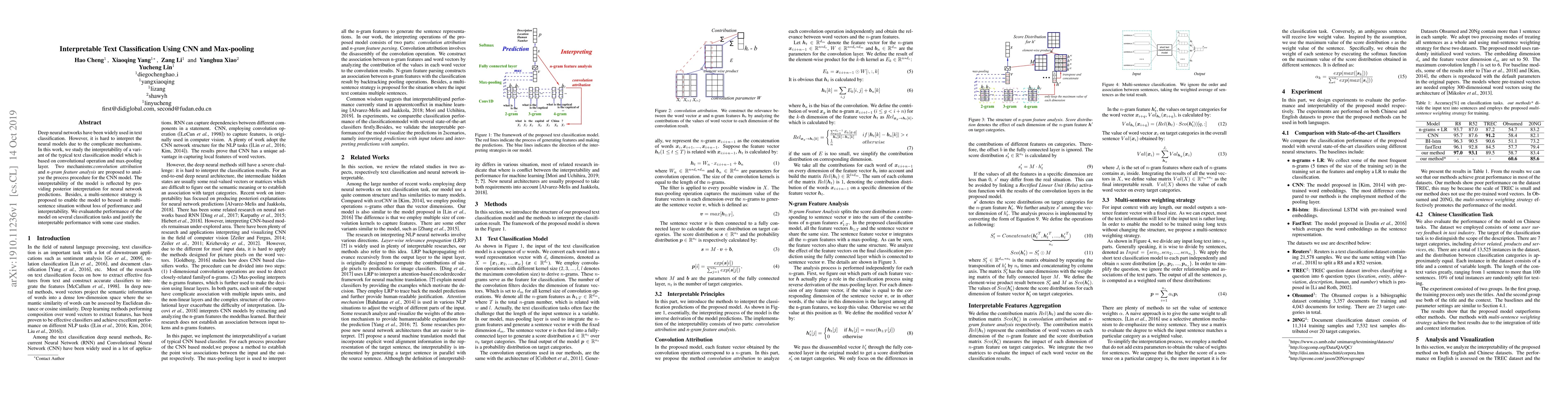 Deep neural networks have been widely used in text classification. However, it is hard to interpret the neural models due to the complicate mechanisms. In this work, we study the interpretability of a variant of the typical text classification model which is based on convolutional operation and max-pooling layer. Two mechanisms: convolution attribution and n-gram feature analysis are proposed to analyse the process procedure for the CNN model. The interpretability of the model is reflected by providing posterior interpretation for neural network predictions. Besides, a multi-sentence strategy is proposed to enable the model to beused in multi-sentence situation without loss of performance and interpret ability. We evaluate the performance of the model on several classification tasks and justify the interpretable performance with some case studies.