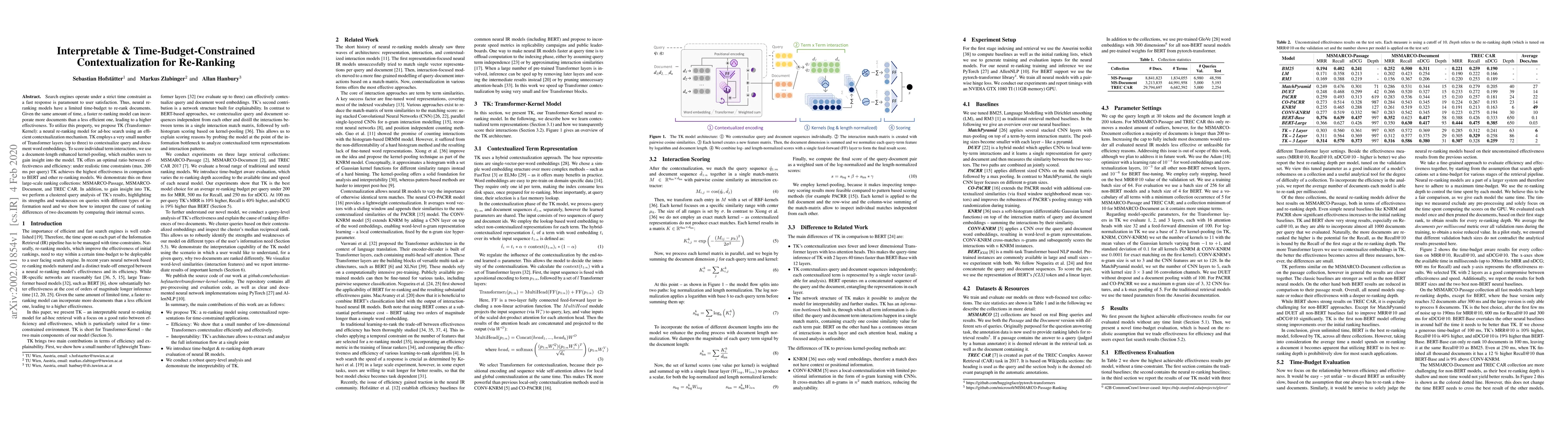 The paper proposes a fast neural re-ranking model called TK, which uses a minimal number of Transformer layers and enhanced kernel-pooling to achieve high effectiveness within strict time constraints. TK balances efficiency and effectiveness, outperforming BERT and other models under realistic time limits.