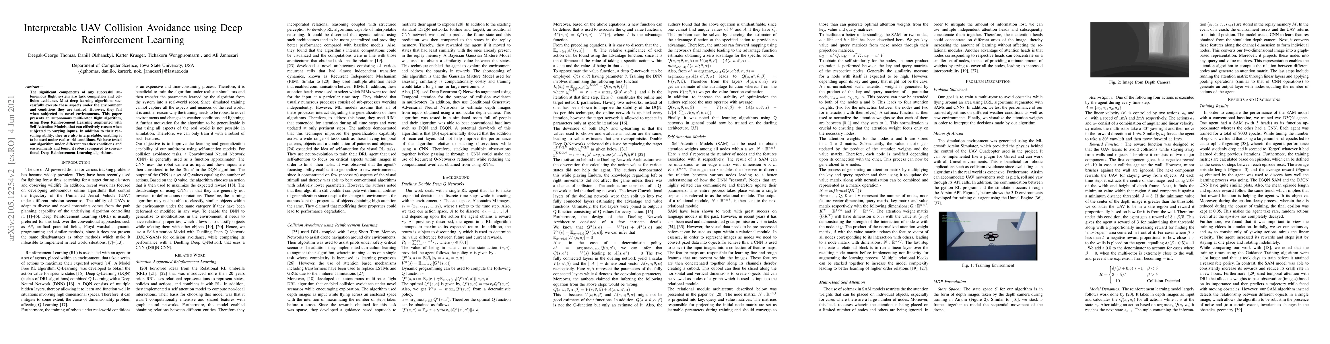 The significant components of any successful autonomous flight system are task completion and collision avoidance. Most deep learning algorithms successfully execute these aspects under the environment and conditions they are trained. However, they fail when subjected to novel environments. This paper presents an autonomous multi-rotor flight algorithm, using Deep Reinforcement Learning augmented with Self-Attention Models, that can effectively reason when subjected to varying inputs. In addition to their reasoning ability, they are also interpretable, enabling it to be used under real-world conditions. We have tested our algorithm under different weather conditions and environments and found it robust compared to conventional Deep Reinforcement Learning algorithms.