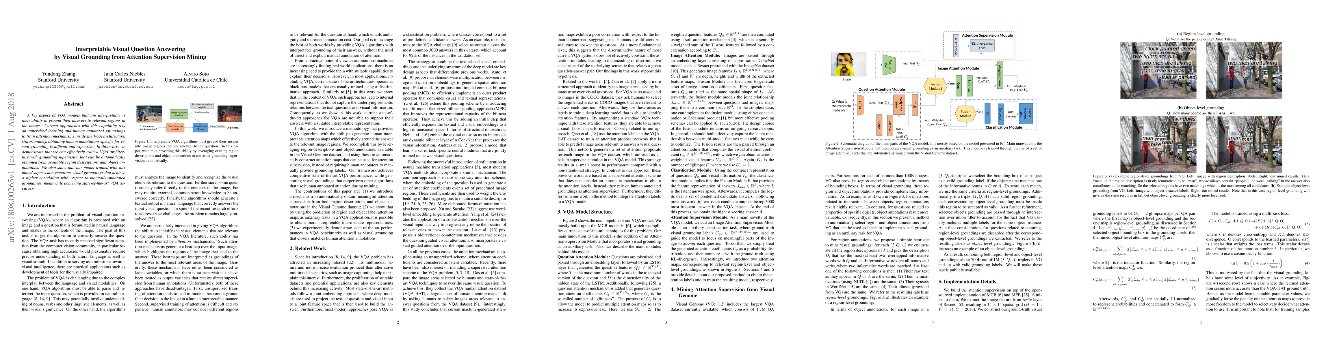 This paper proposes a method to train interpretable visual question answering (VQA) models using automatically mined supervision from region descriptions and object annotations, instead of costly human-annotated groundings. The resulting model achieves state-of-the-art VQA accuracy and generates visual groundings that correlate well with manually-annotated ones.