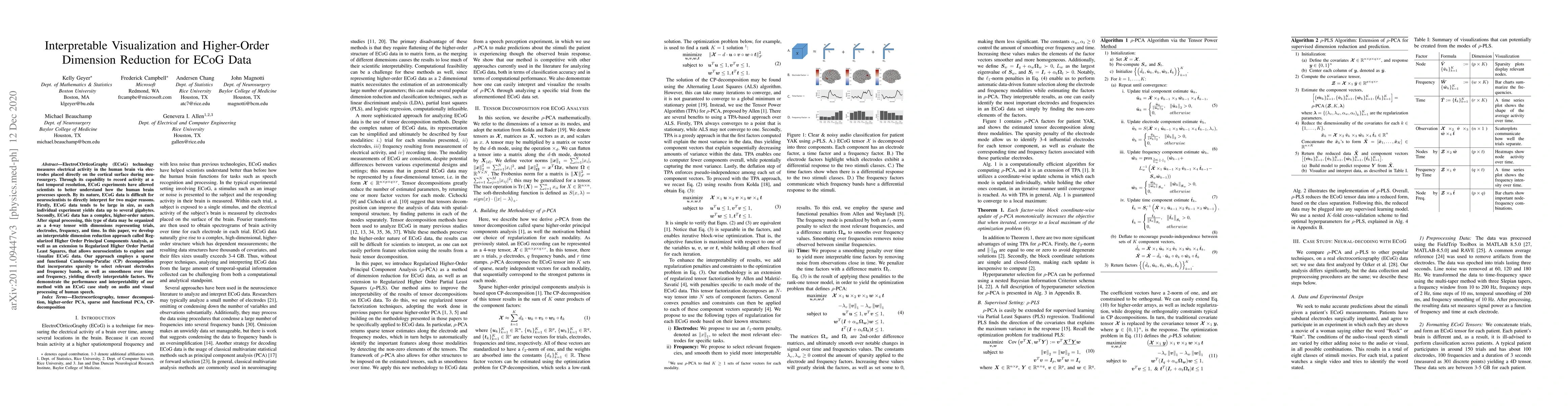ElectroCOrticoGraphy (ECoG) technology measures electrical activity in the human brain via electrodes placed directly on the cortical surface during neurosurgery. Through its capability to record activity at a fast temporal resolution, ECoG experiments have allowed scientists to better understand how the human brain processes speech. By its nature, ECoG data is difficult for neuroscientists to directly interpret for two major reasons. Firstly, ECoG data tends to be large in size, as each individual experiment yields data up to several gigabytes. Secondly, ECoG data has a complex, higher-order nature. After signal processing, this type of data may be organized as a 4-way tensor with dimensions representing trials, electrodes, frequency, and time. In this paper, we develop an interpretable dimension reduction approach called Regularized Higher Order Principal Components Analysis, as well as an extension to Regularized Higher Order Partial Least Squares, that allows neuroscientists to explore and visualize ECoG data. Our approach employs a sparse and functional Candecomp-Parafac (CP) decomposition that incorporates sparsity to select relevant electrodes and frequency bands, as well as smoothness over time and frequency, yielding directly interpretable factors. We demonstrate the performance and interpretability of our method with an ECoG case study on audio and visual processing of human speech.