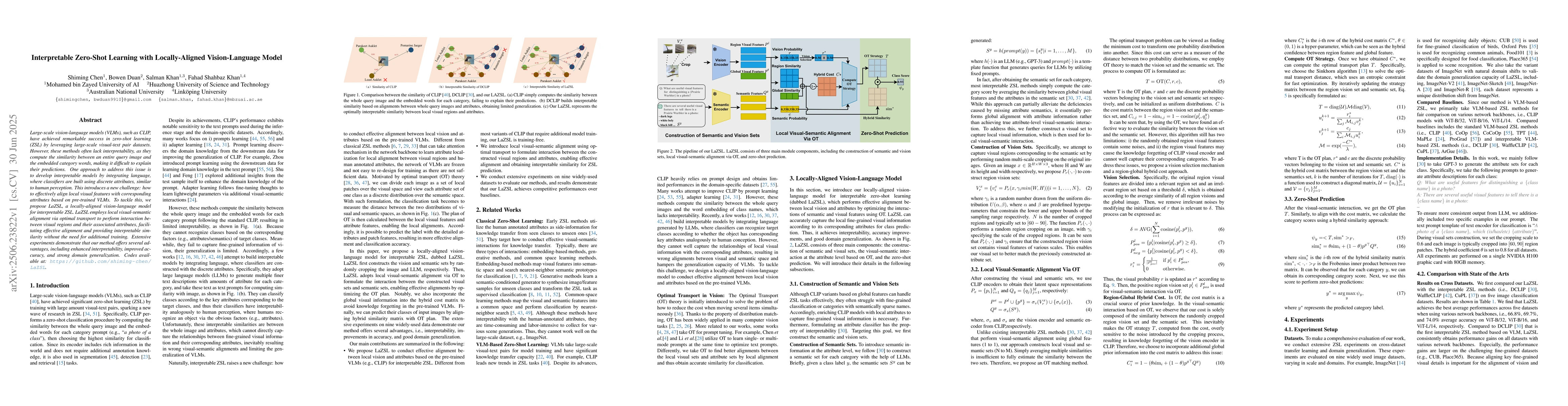 Large-scale vision-language models (VLMs), such as CLIP, have achieved remarkable success in zero-shot learning (ZSL) by leveraging large-scale visual-text pair datasets. However, these methods often lack interpretability, as they compute the similarity between an entire query image and the embedded category words, making it difficult to explain their predictions. One approach to address this issue is to develop interpretable models by integrating language, where classifiers are built using discrete attributes, similar to human perception. This introduces a new challenge: how to effectively align local visual features with corresponding attributes based on pre-trained VLMs. To tackle this, we propose LaZSL, a locally-aligned vision-language model for interpretable ZSL. LaZSL employs local visual-semantic alignment via optimal transport to perform interaction between visual regions and their associated attributes, facilitating effective alignment and providing interpretable similarity without the need for additional training. Extensive experiments demonstrate that our method offers several advantages, including enhanced interpretability, improved accuracy, and strong domain generalization. Codes available at: https://github.com/shiming-chen/LaZSL.