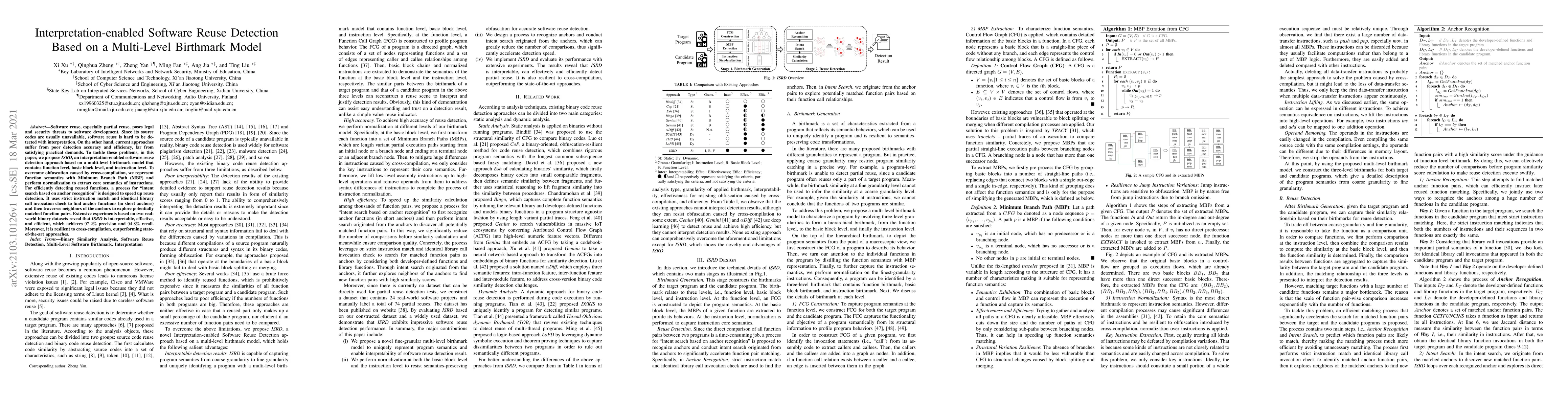 Software reuse, especially partial reuse, poses legal and security threats to software development. Since its source codes are usually unavailable, software reuse is hard to be detected with interpretation. On the other hand, current approaches suffer from poor detection accuracy and efficiency, far from satisfying practical demands. To tackle these problems, in this paper, we propose \textit{ISRD}, an interpretation-enabled software reuse detection approach based on a multi-level birthmark model that contains function level, basic block level, and instruction level. To overcome obfuscation caused by cross-compilation, we represent function semantics with Minimum Branch Path (MBP) and perform normalization to extract core semantics of instructions. For efficiently detecting reused functions, a process for "intent search based on anchor recognition" is designed to speed up reuse detection. It uses strict instruction match and identical library call invocation check to find anchor functions (in short anchors) and then traverses neighbors of the anchors to explore potentially matched function pairs. Extensive experiments based on two real-world binary datasets reveal that \textit{ISRD} is interpretable, effective, and efficient, which achieves $97.2\%$ precision and $94.8\%$ recall. Moreover, it is resilient to cross-compilation, outperforming state-of-the-art approaches.