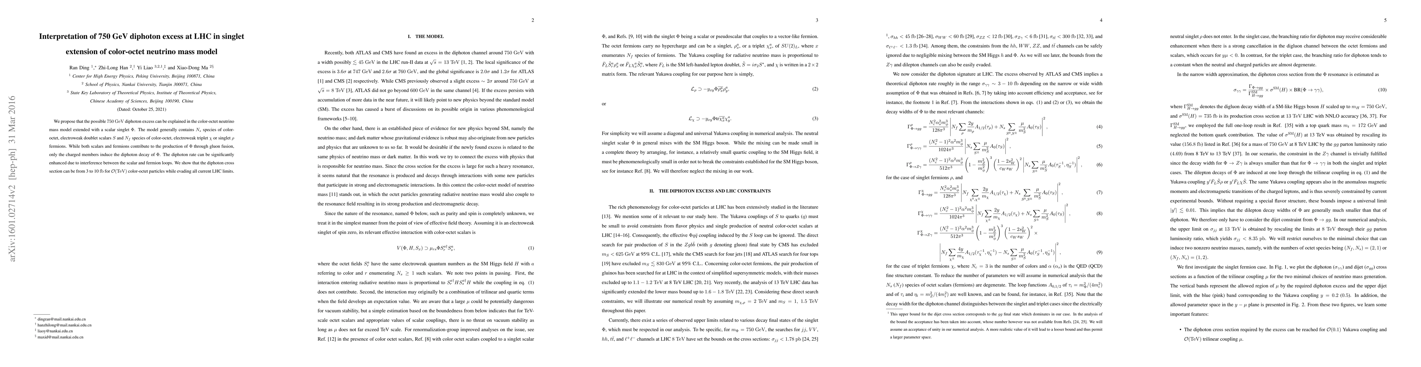 This paper proposes that the 750 GeV diphoton excess observed at the LHC can be explained by a singlet extension of a color-octet neutrino mass model, where the scalar singlet $\Phi$ and color-octet particles contribute to the diphoton production and decay. The model allows for significant enhancement of the diphoton rate through interference effects while remaining consistent with current LHC constraints.