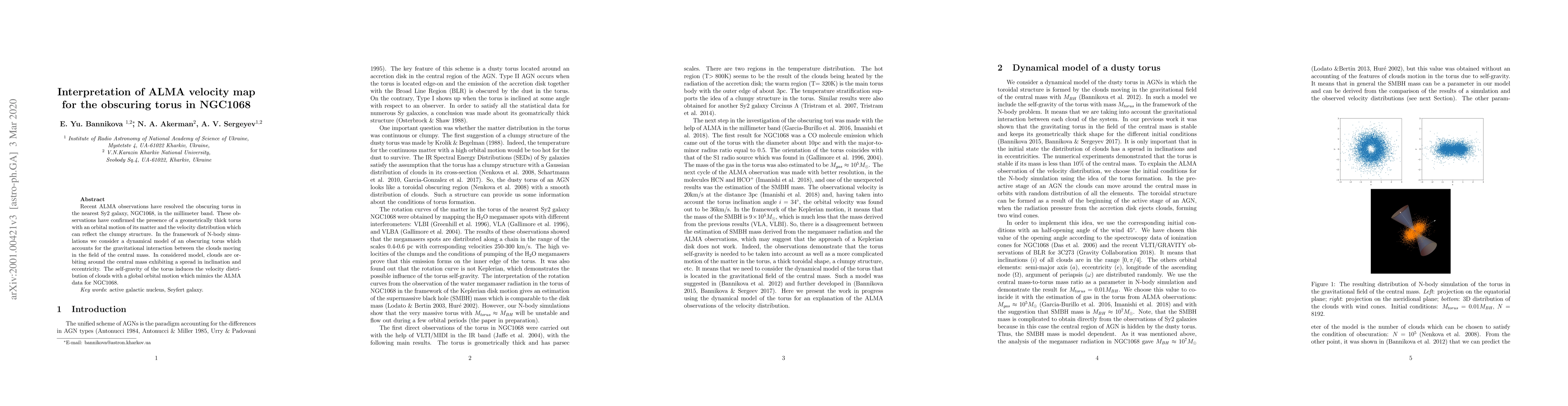 Recent ALMA observations have resolved the obscuring torus in the nearest Sy2 galaxy, NGC1068, in the millimeter band. These observations have confirmed the presence of a geometrically thick torus with an orbital motion of its matter and the velocity distribution which can reflect the clumpy structure. In the framework of N-body simulations we consider a dynamical model of an obscuring torus which accounts for the gravitational interaction between the clouds moving in the field of the central mass. In considered model, clouds are orbiting around the central mass exhibiting a spread in inclination and eccentricity. The self-gravity of the torus induces the velocity distribution of clouds with a global orbital motion which mimics the ALMA data for NGC1068.