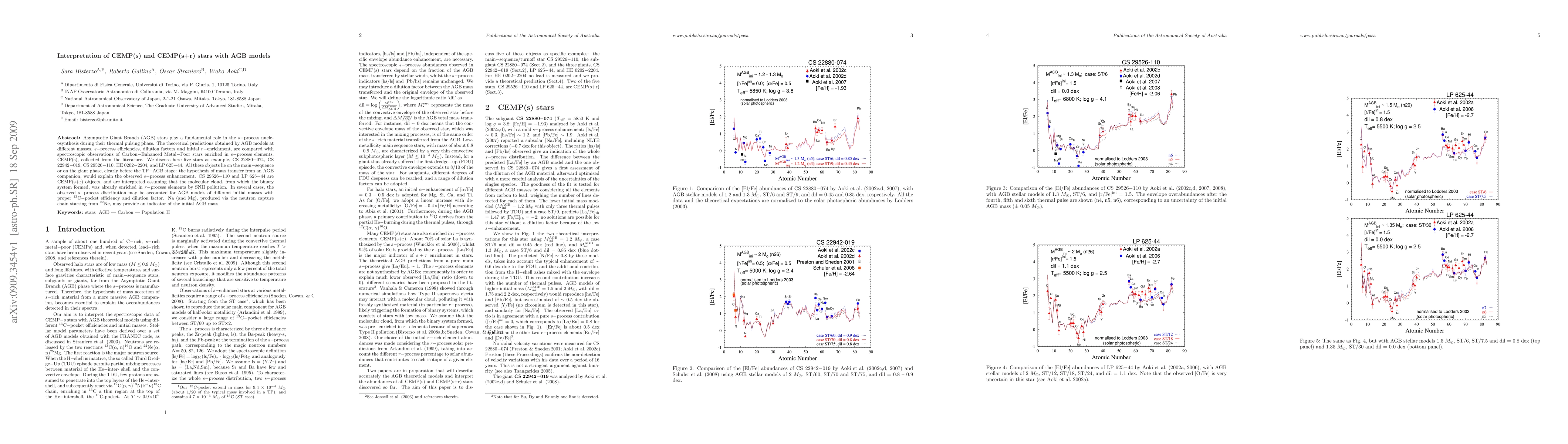 This paper compares AGB models' theoretical predictions with spectroscopic observations of CEMP(s) and CEMP(s+r) stars, suggesting mass transfer from an AGB companion explains the observed s-process enhancement, with Na and Mg indicating initial AGB mass.