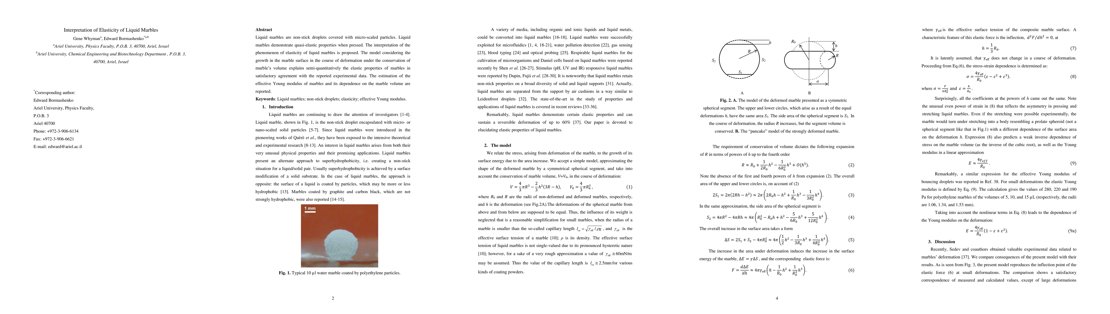 The paper proposes a model explaining the elasticity of liquid marbles, non-sticky droplets coated with micro-particles. The model, based on volume conservation and surface area increase during deformation, aligns well with experimental data. It estimates the effective Young modulus of marbles, which depends on their volume.