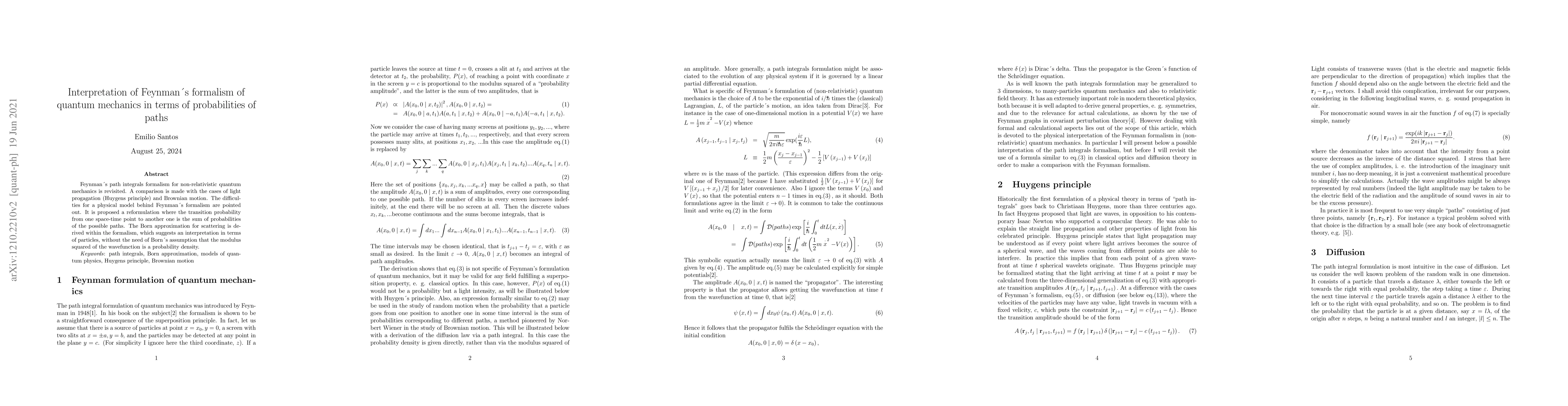This paper revisits Feynman's path integral formalism, proposing a reformulation where transition probabilities are summed over possible paths, and derives the Born approximation for scattering, suggesting a particle interpretation without relying on the Born assumption. It highlights difficulties in the physical model behind the original formalism.