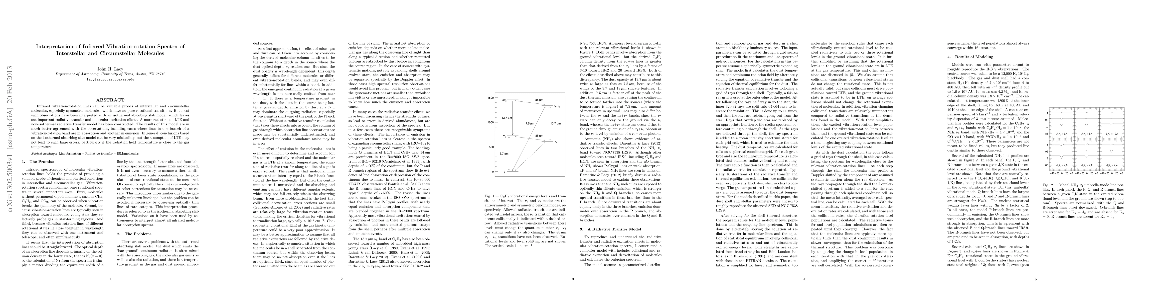 Infrared vibration-rotation lines can be valuable probes of interstellar and circumstellar molecules, especially symmetric molecules, which have no pure rotational transitions. But most such observations have been interpreted with an isothermal absorbing slab model, which leaves out important radiative transfer and molecular excitation effects. A more realistic non-LTE and non-isothermal radiative transfer model has been constructed. The results of this model are in much better agreement with the observations, including cases where lines in one branch of a vibration-rotation band are in absorption and another in emission. In general, conclusions based on the isothermal absorbing slab model can be very misleading, but the assumption of LTE may not lead to such large errors, particularly if the radiation field temperature is close to the gas temperature.