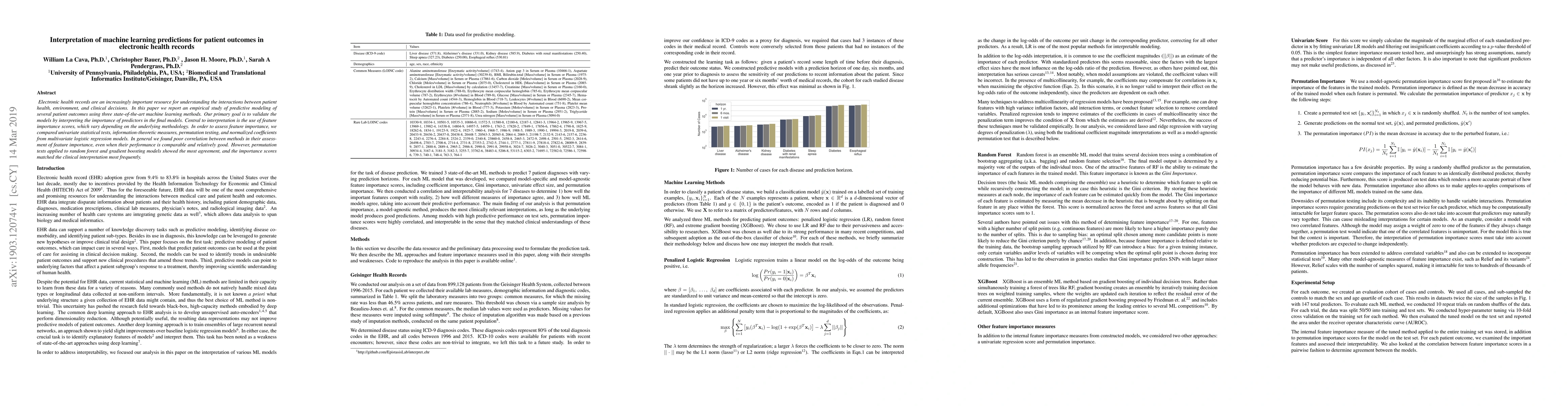 Electronic health records are an increasingly important resource for understanding the interactions between patient health, environment, and clinical decisions. In this paper we report an empirical study of predictive modeling of several patient outcomes using three state-of-the-art machine learning methods. Our primary goal is to validate the models by interpreting the importance of predictors in the final models. Central to interpretation is the use of feature importance scores, which vary depending on the underlying methodology. In order to assess feature importance, we compared univariate statistical tests, information-theoretic measures, permutation testing, and normalized coefficients from multivariate logistic regression models. In general we found poor correlation between methods in their assessment of feature importance, even when their performance is comparable and relatively good. However, permutation tests applied to random forest and gradient boosting models showed the most agreement, and the importance scores matched the clinical interpretation most frequently.