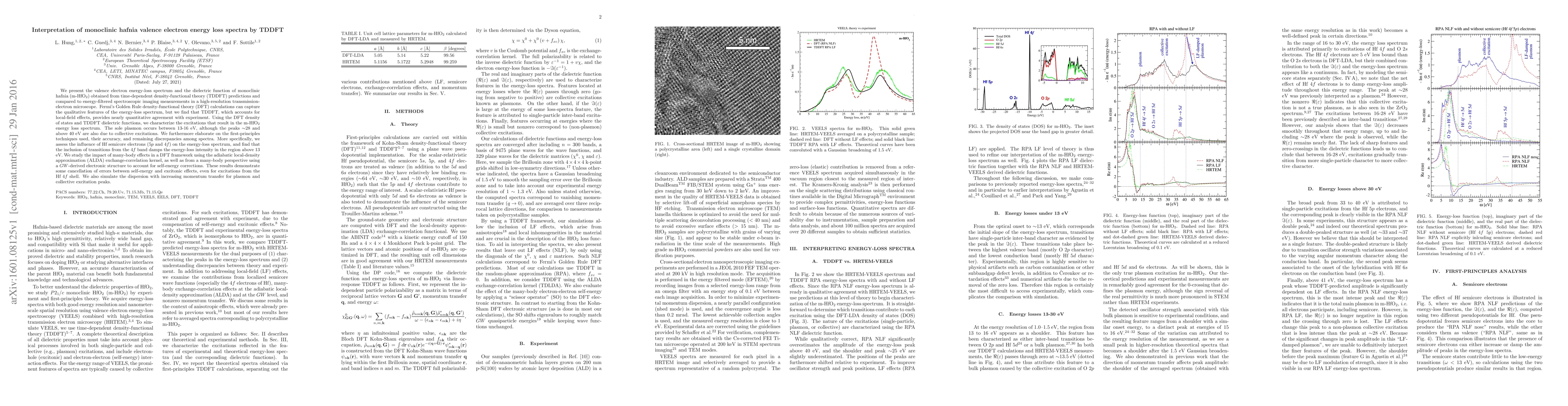 This paper uses time-dependent density-functional theory (TDDFT) to interpret the valence electron energy-loss spectrum and dielectric function of monoclinic hafnia (m-HfO$_2$), achieving nearly quantitative agreement with experimental measurements. The study highlights the importance of local-field effects and many-body corrections in accurately modeling the energy-loss spectrum, particularly the influence of Hf semicore electrons.