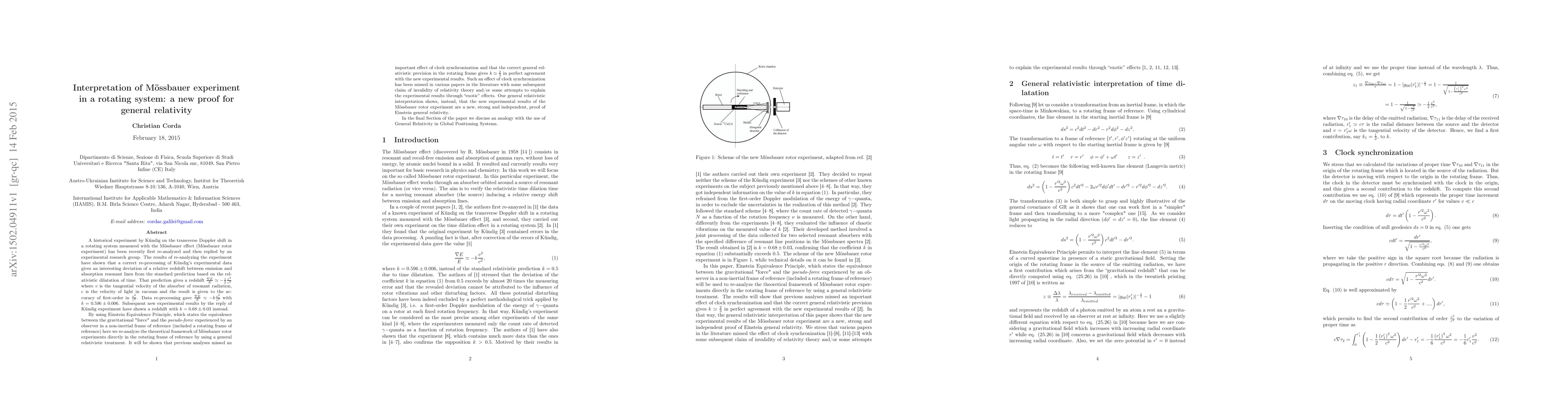 A historical experiment by K\"undig on the transverse Doppler shift in a rotating system measured with the M\"ossbauer effect has been recently first re-analyzed and then replied [1,2]. The results have shown that a correct re-processing of K\"undig's experimental data gives a deviation of a relative redshift between emission and absorption resonant lines from the prediction due to relativistic dilatation of time, which, at first-order in \frac{v^{2}}{c^{2}}, gives a redshift \frac{\nabla E}{E}\simeq-\frac{1}{2}\frac{v^{2}}{c^{2}} where v is the tangential velocity of the absorber of resonant radiationa and c is the velocity of light in vacuum. Data re-processing gave \frac{\nabla E}{E}\simeq-k\frac{v^{2}}{c^{2}} with k=0.596\pm0.006. Subsequent new experimental results [2] have shown a redshift with k=0.68\pm0.03 instead. Using Einstein Equivalence Principle on the equivalence between the gravitational "force" and the pseudo-force experienced by an observer in a rotating frame of reference, here we re-analyze the theoretical framework of M\"ossbauer rotor experiments directly in the rotating frame through a general relativistic treatment. We show that previous analyses missed an important effect of clock synchronization and that the correct general relativistic prevision in the rotating frame gives k\simeq\frac{2}{3} in perfect agreement with the new experimental results. Such an effect of clock synchronization has been missed in various papers in the literature with some subsequent claim of invalidity of relativity theory and/or some attempts to explain the experimental results through "exotic" effects. Our general relativistic interpretation shows, instead, that the new experimental results of the M\"ossbauer rotor experiment are a new, strong and independent, proof of general relativity. Finally, we discuss an analogy with the use of general relativity in Global Positioning Systems.