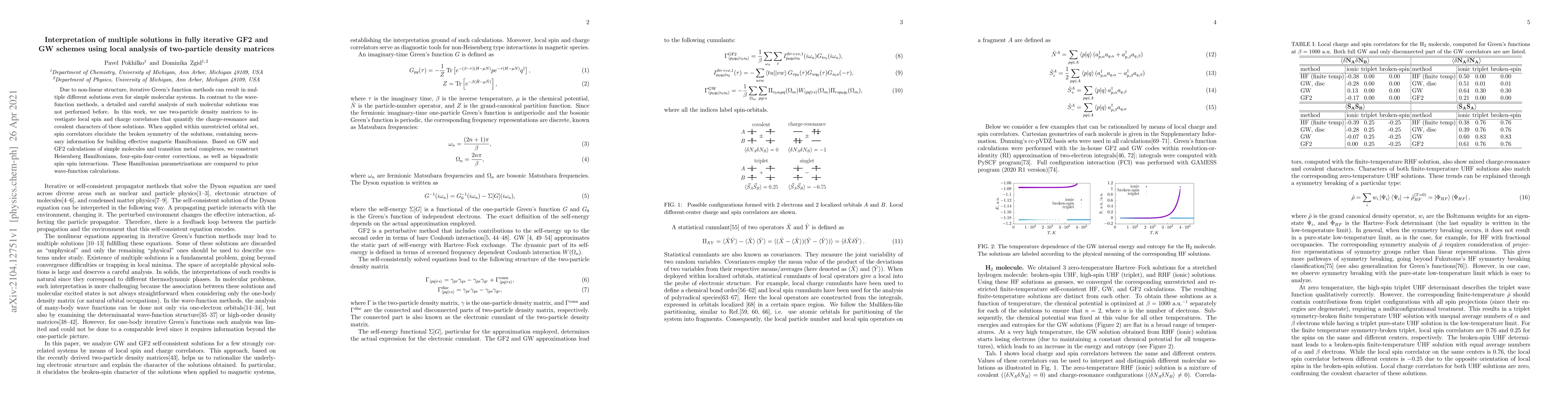 Due to non-linear structure, iterative Green's function methods can result in multiple different solutions even for simple molecular systems. In contrast to the wave-function methods, a detailed and careful analysis of such molecular solutions was not performed before. In this work, we use two-particle density matrices to investigate local spin and charge correlators that quantify the charge-resonance and covalent characters of these solutions. When applied within unrestricted orbital set, spin correlators elucidate the broken symmetry of the solutions, containing necessary information for building effective magnetic Hamiltonians. Based on GW and GF2 calculations of simple molecules and transition metal complexes, we construct Heisenberg Hamiltonians, four-spin-four-center corrections, as well as biquadratic spin-spin interactions. These Hamiltonian parametrizations are compared to prior wave-function calculations.