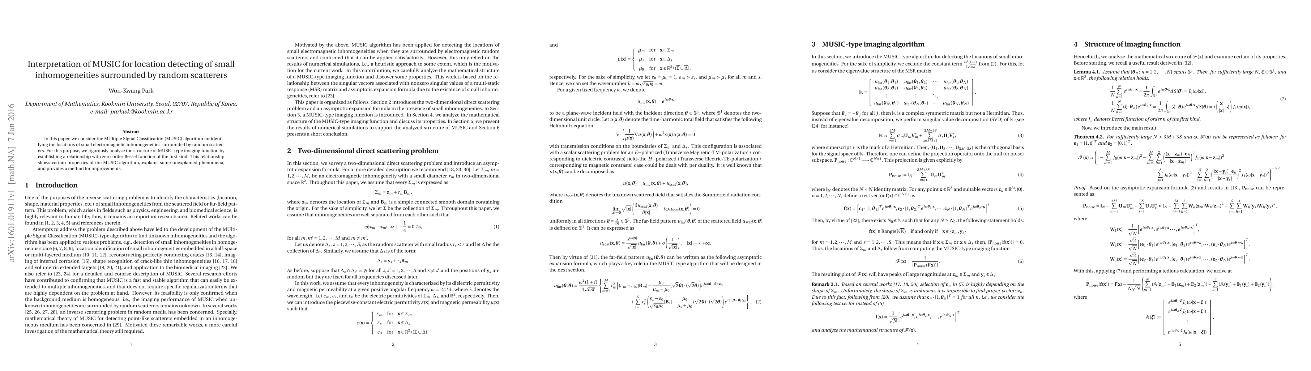 In this paper, we consider the MUltiple SIgnal Classification (MUSIC) algorithm for identifying the locations of small electromagnetic inhomogeneities surrounded by random scatterers. For this purpose, we rigorously analyze the structure of MUSIC-type imaging function by establishing a relationship with zero-order Bessel function of the first kind. This relationship shows certain properties of the MUSIC algorithm, explains some unexplained phenomena, and provides a method for improvements.