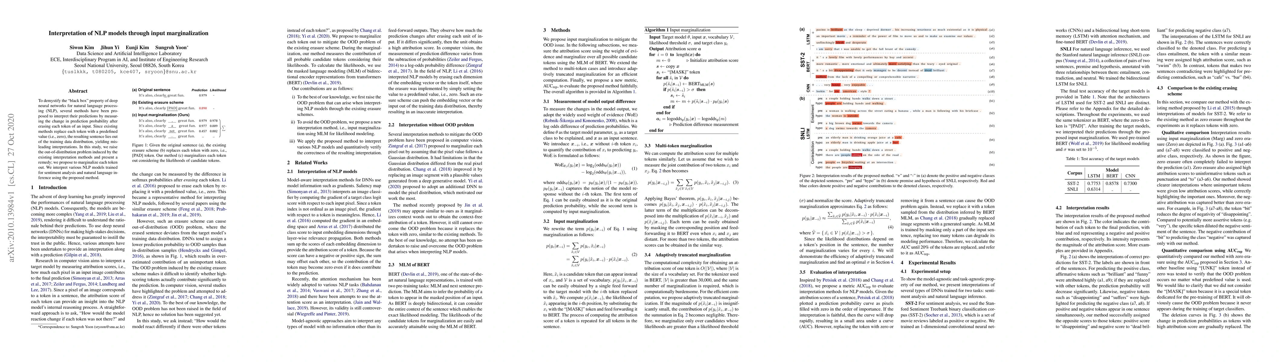 To demystify the "black box" property of deep neural networks for natural language processing (NLP), several methods have been proposed to interpret their predictions by measuring the change in prediction probability after erasing each token of an input. Since existing methods replace each token with a predefined value (i.e., zero), the resulting sentence lies out of the training data distribution, yielding misleading interpretations. In this study, we raise the out-of-distribution problem induced by the existing interpretation methods and present a remedy; we propose to marginalize each token out. We interpret various NLP models trained for sentiment analysis and natural language inference using the proposed method.