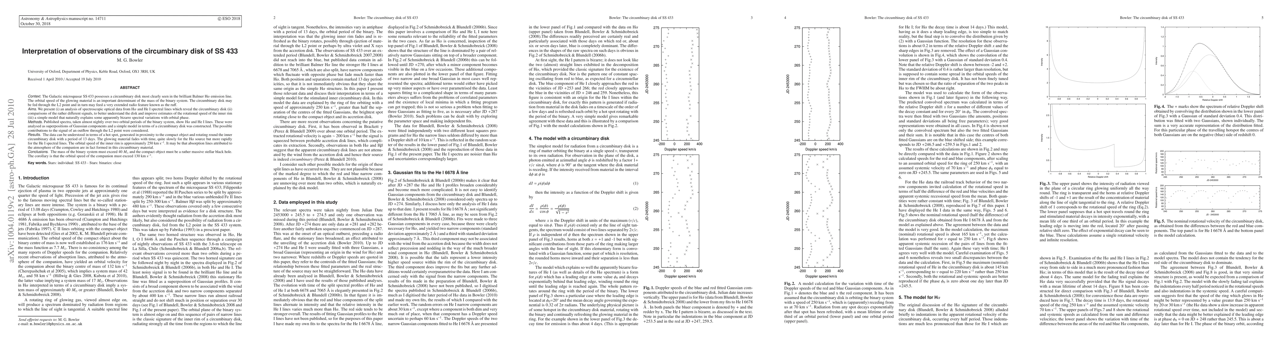 Context. The Galactic microquasar SS 433 is possessed of a circumbinary disk most clearly seen in the brilliant Balmer H alpha emission line. The orbital speed of the glowing material is an important determinant of the mass of the binary system. The circumbinary disk may be fed through the L2 point and in turn may feed a very extended radio feature known as the ruff. Aims. To present an analysis of spectroscopic optical data from H alpha and He I spectral lines which reveal the circumbinary disk. To use comparisons of the rather different signals to better understand the disk and improve estimates of the rotational speed of the inner rim. To present a simple model which naturally explains some apparently bizarre spectral variations with orbital phase. Methods. Published spectra, taken almost nightly over two orbital periods of the binary system, are analysed. H alpha and He I lines are analysed as superpositions of Gaussian components and a simple model constructed. Results. The data are understood in terms of a hot spot, generated by proximity of the compact object, rotating round the inner circumbinary disk with a period of 13 days. The glowing material fades with time, quite slowly for the H alpha source but more rapidly for the He I spectral lines. The orbital speed of the inner rim is approximately 250 km/s. Conclusions. The mass of the binary system must exceed 40 solar masses and the compact object must be a rather massive stellar black hole. The corollary is that the orbital speed of the companion must exceed 130 km/s.