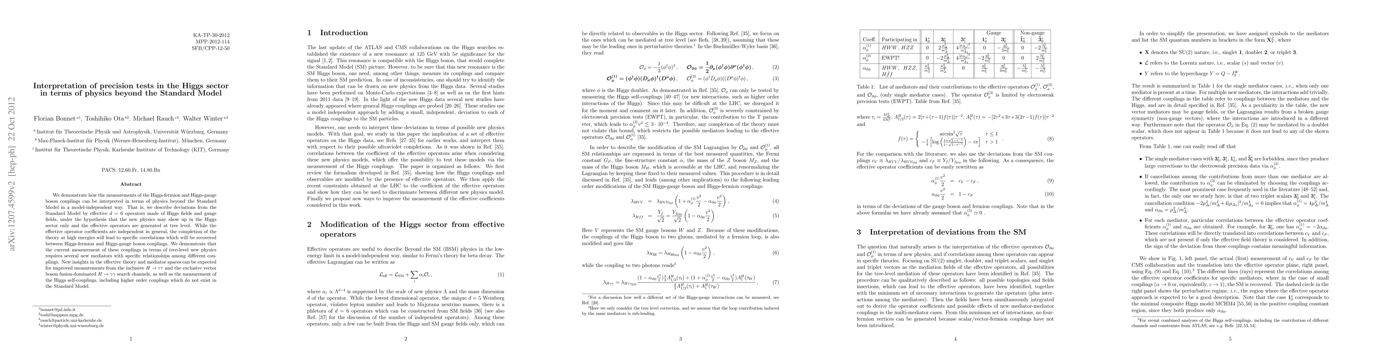 We demonstrate how the measurements of the Higgs-fermion and Higgs-gauge boson couplings can be interpreted in terms of physics beyond the Standard Model in a model-independent way. That is, we describe deviations from the Standard Model by effective $d=6$ operators made of Higgs fields and gauge fields, under the hypothesis that the new physics may show up in the Higgs sector only and the effective operators are generated at tree level. While the effective operator coefficients are independent in general, the completion of the theory at high energies will lead to specific correlations which will be recovered between Higgs-fermion and Higgs-gauge boson couplings. We demonstrate that the current measurement of these couplings in terms of tree-level new physics requires several new mediators with specific relationships among different couplings. New insights in the effective theory and mediator spaces can be expected for improved measurements from the inclusive $H \rightarrow \tau \tau$ and the exclusive vector boson fusion-dominated $H \rightarrow \gamma \gamma$ search channels, as well as the measurement of the Higgs self-couplings, including higher order couplings which do not exist in the Standard Model.
