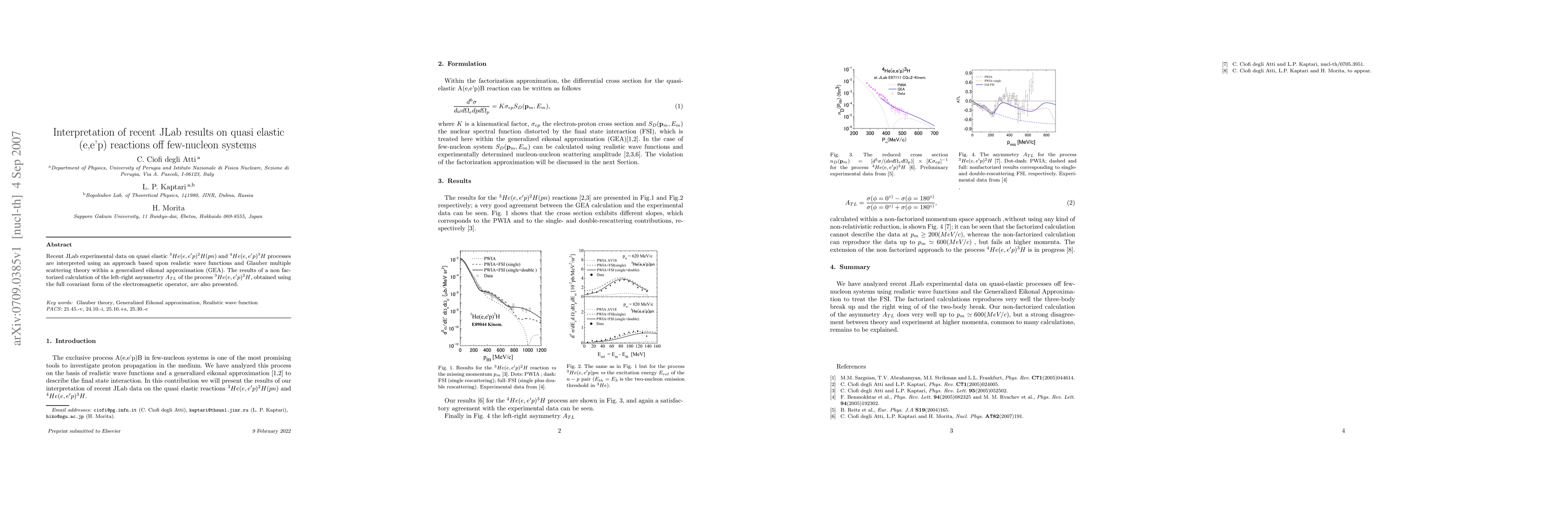Recent JLab experimental data on quasi elastic 3He(e,e'p)2H(pn) and 4He(e,e'p)3H processes are interpreted using an approach based upon realistic wave functions and Glauber multiple scattering theory within a generalized eikonal approximation (GEA). The results of a non factorized calculation of the left-right asymmetry A_{TL} of the process 3He(e,e'p)2H, obtained using the full covariant form of the electromagnetic operator, are also presented.