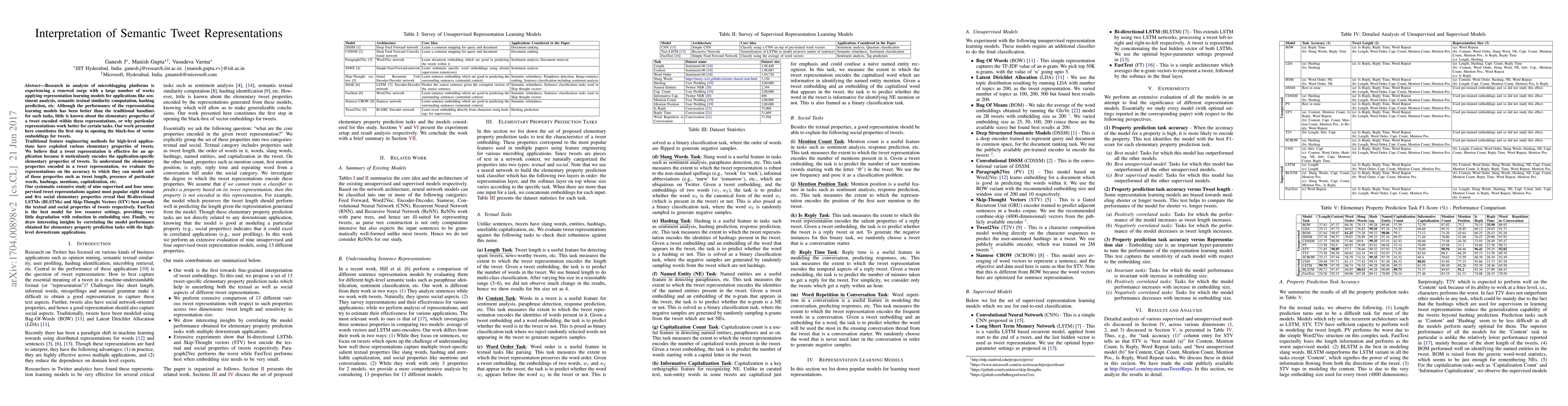 This paper explores the properties of semantic tweet representations, evaluating nine supervised and four unsupervised models against eight textual and five social properties. It finds that Bi-directional LSTMs and Skip-Thought Vectors best encode textual and social properties, respectively, while FastText is optimal for low-resource settings. The study correlates model performance on elementary tasks with their effectiveness in high-level applications.