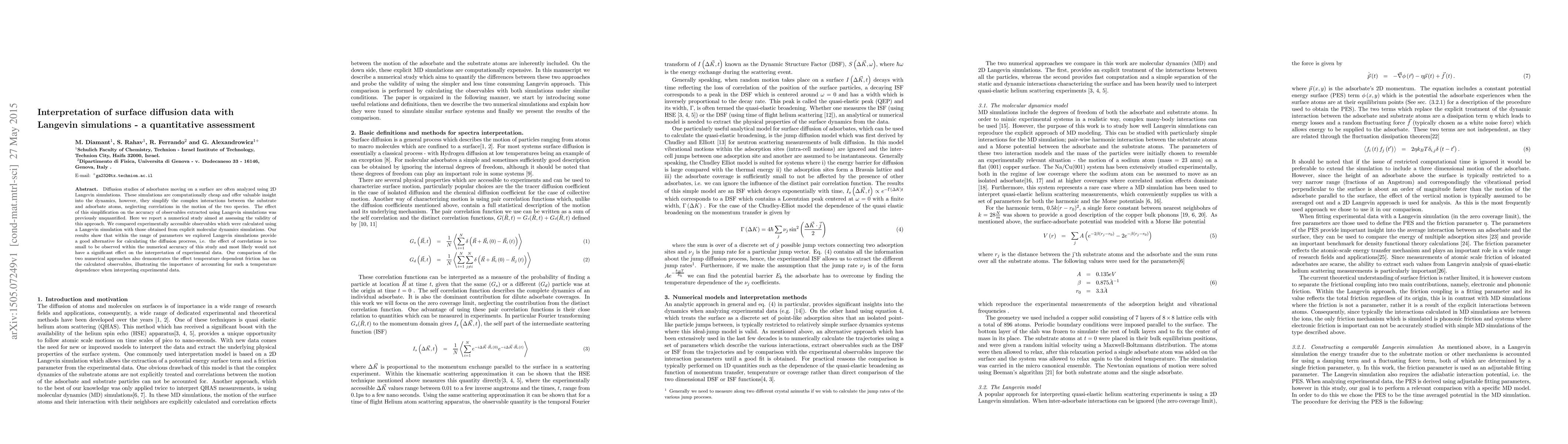 Diffusion studies of adsorbates moving on a surface are often analyzed using 2D Langevin simulations. These simulations are computationally cheap and offer valuable insight into the dynamics, however, they simplify the complex interactions between the substrate and adsorbate atoms, neglecting correlations in the motion of the two species. The effect of this simplification on the accuracy of observables extracted using Langevin simulations was previously unquantified. Here we report a numerical study aimed at assessing the validity of this approach. We compared experimentally accessible observables which were calculated using a Langevin simulation with those obtained from explicit molecular dynamics simulations. Our results show that within the range of parameters we explored Langevin simulations provide a good alternative for calculating the diffusion procress, i.e. the effect of correlations is too small to be observed within the numerical accuracy of this study and most likely would not have a significant effect on the interpretation of experimental data. Our comparison of the two numerical approaches also demonstrates the effect temperature dependent friction has on the calculated observables, illustrating the importance of accounting for such a temperature dependence when interpreting experimental data.