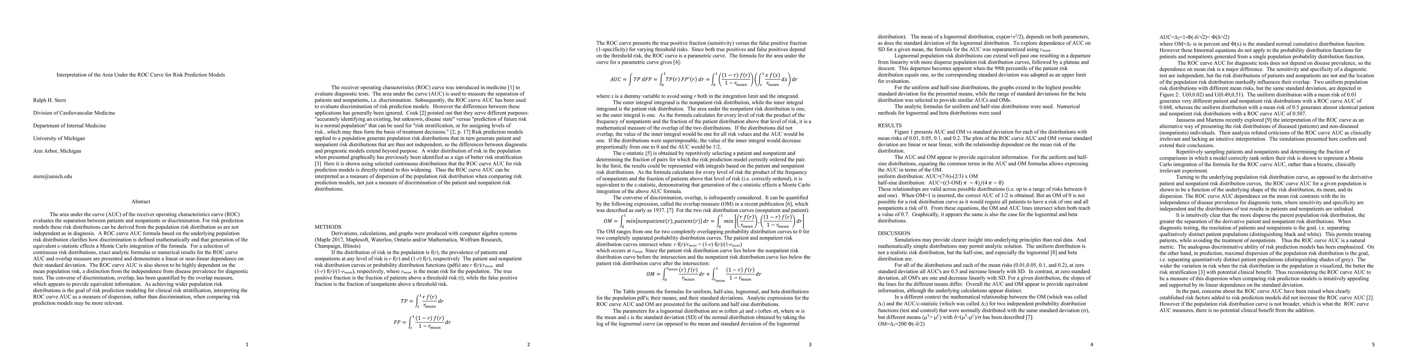 The area under the curve (AUC) of the receiver operating characteristics curve (ROC) evaluates the separation between patients and nonpatients or discrimination. For risk prediction models these risk distributions can be derived from the population risk distribution so are not independent as in diagnosis. A ROC curve AUC formula based on the underlying population risk distribution clarifies how discrimination is defined mathematically and that generation of the equivalent c-statistic effects a Monte Carlo integration of the formula. For a selection of continuous risk distributions, exact analytic formulas or numerical results for the ROC curve AUC and overlap measure are presented and demonstrate a linear or near-linear dependence on their standard deviation. The ROC curve AUC is also shown to be highly dependent on the mean population risk, a distinction from the independence from disease prevalence for diagnostic tests. The converse of discrimination, overlap, has been quantified by the overlap measure, which appears to provide equivalent information. As achieving wider population risk distributions is the goal of risk prediction modeling for clinical risk stratification, interpreting the ROC curve AUC as a measure of dispersion, rather than discrimination, when comparing risk prediction models may be more relevant.
