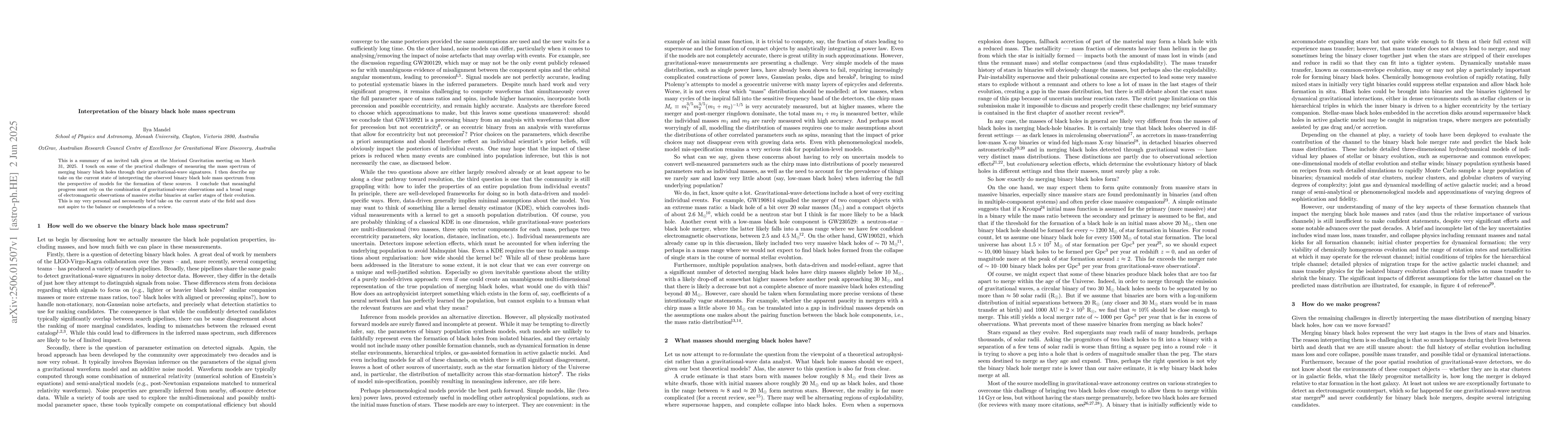 This is a summary of an invited talk given at the Moriond Gravitation meeting on March 31, 2025. I touch on some of the practical challenges of measuring the mass spectrum of merging binary black holes through their gravitational-wave signatures. I then describe my take on the current state of interpreting the observed binary black hole mass spectrum from the perspective of models for the formation of these sources. I conclude that meaningful progress must rely on the combination of gravitational-wave observations and a broad range of electromagnetic observations of massive stellar binaries at earlier stages of their evolution. This is my very personal and necessarily brief take on the current state of the field and does not aspire to the balance or completeness of a review.