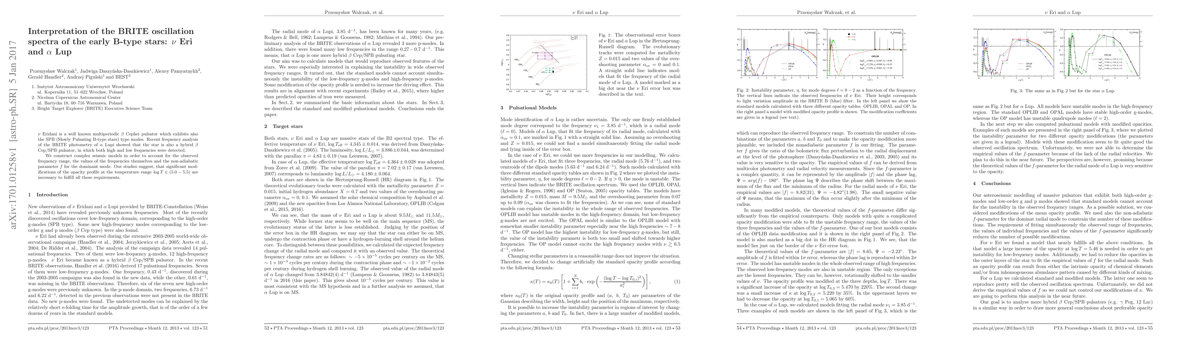 This paper analyzes the oscillation spectra of early B-type stars $\nu$ Eri and $\alpha$ Lup, revealing their multiperiodic nature as hybrid $\beta$ Cep/SPB pulsators. It proposes that significant opacity profile modifications in the temperature range $\log{T}\in (5.0-5.5)$ are needed to match the observed frequencies and seismic models.