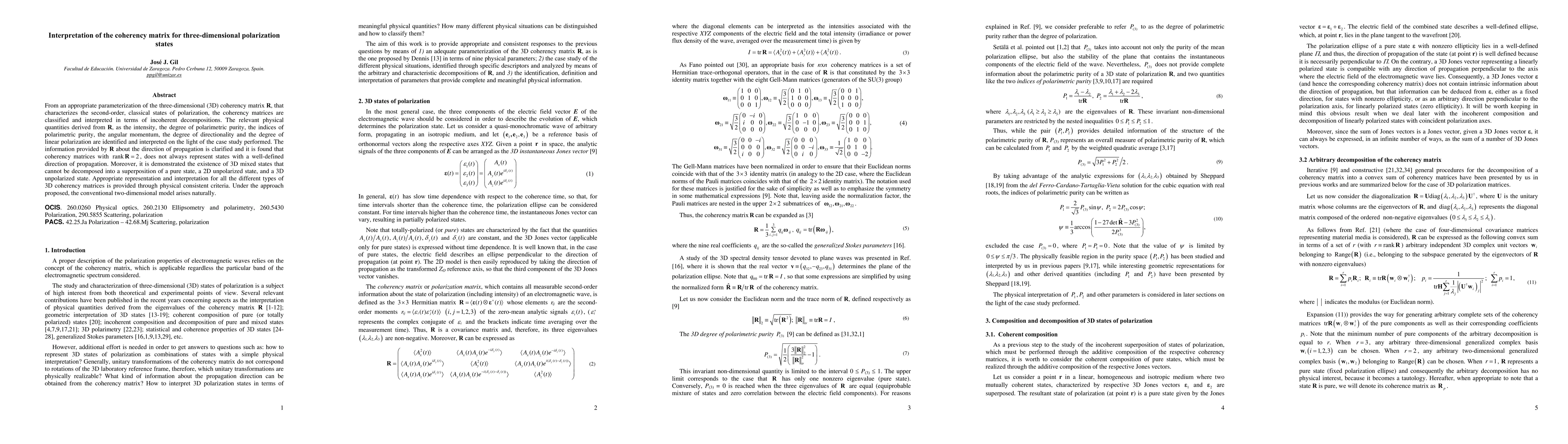 From an appropriate parameterization of the three-dimensional (3D) coherency matrix R, that characterizes the second-order, classical states of polarization, the coherency matrices are classified and interpreted in terms of incoherent decompositions. The relevant physical quantities derived from R, as the intensity, the degree of polarimetric purity, the indices of polarimetric purity, the angular momentum, the degree of directionality and the degree of linear polarization are identified and interpreted on the light of the case study performed. The information provided by R about the direction of propagation is clarified and it is found that coherency matrices with, does not always represent states with a well-defined direction of propagation. Moreover, it is demonstrated the existence of 3D mixed states that cannot be decomposed into a superposition of a pure state, a 2D unpolarized state, and a 3D unpolarized state. Appropriate representation and interpretation for all the different types of 3D coherency matrices is provided through physical consistent criteria. Under the approach proposed, the conventional two-dimensional model arises naturally.