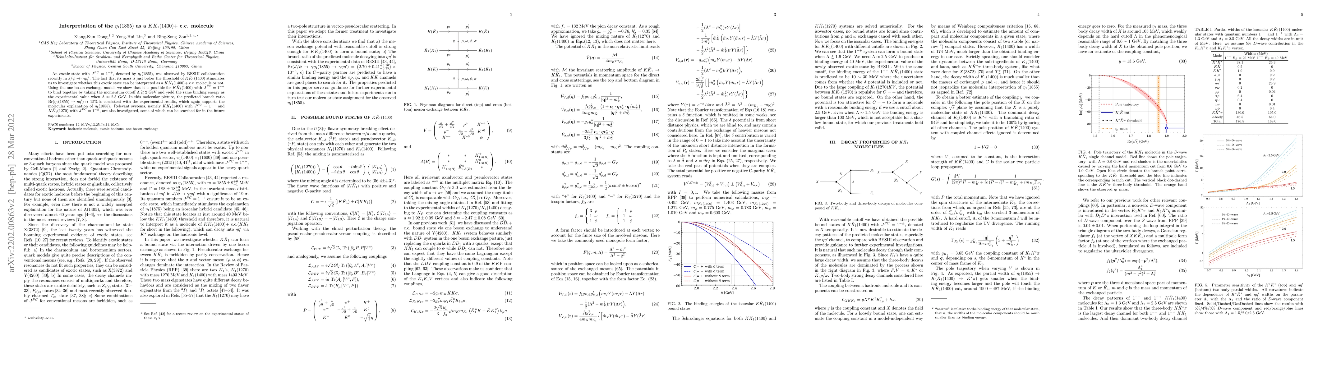 An exotic state with $J^{PC}=1^{-+}$, denoted by $\eta_1(1855)$, was observed by BESIII collaboration recently in $J/\psi \to \gamma \eta\eta'$. The fact that its mass is just below the threshold of $K\bar K_1(1400)$ stimulates us to investigate whether this exotic state can be interpreted as a $K\bar K_1(1400)+$ c.c { molecule or not}. Using the one boson exchange model, we show that it is possible for $K\bar K_1(1400)$ with $J^{PC}=1^{-+}$ to bind together by taking the momentum cutoff $\Lambda\gtrsim 2$ GeV and yield the same binding energy as the experimental value when $\Lambda\approx 2.5$ GeV. In this molecular picture, the predicted branch ratio $\mathrm{Br}(\eta_1(1855)\to\eta\eta') \approx 15\%$ is consistent with the experimental results, which again supports the molecular explanation of $\eta_1(1855)$. Relevant systems, namely $K\bar K_1(1400)$ with $J^{PC}=1^{--}$ and $K\bar K_1(1270)$ with $J^{PC}=1^{-\pm}$, are also investigated, some of which can be searched for in the future experiments.