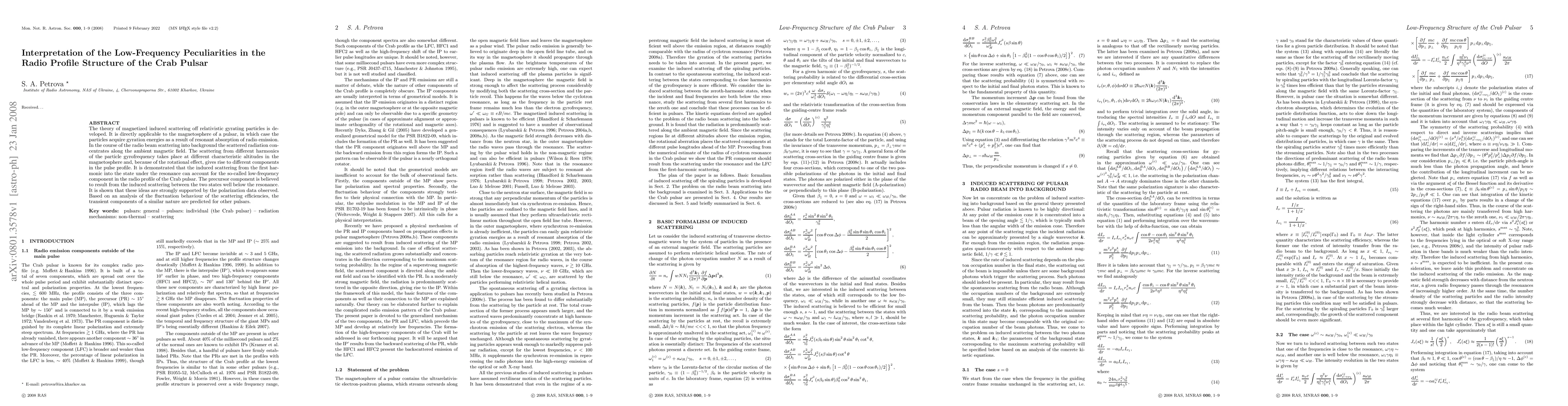The theory of magnetized induced scattering off relativistic gyrating particles is developed. It is directly applicable to the magnetosphere of a pulsar, in which case the particles acquire gyration energies as a result of resonant absorption of radio emission. In the course of the radio beam scattering into background the scattered radiation concentrates along the ambient magnetic field. The scattering from different harmonics of the particle gyrofrequency takes place at different characteristic altitudes in the magnetosphere and, because of the rotational effect, gives rise to different components in the pulse profile. It is demonstrated that the induced scattering from the first harmonic into the state under the resonance can account for the so-called low-frequency component in the radio profile of the Crab pulsar. The precursor component is believed to result from the induced scattering between the two states well below the resonance. It is shown that these ideas are strongly supported by the polarization data observed. Based on an analysis of the fluctuation behaviour of the scattering efficiencies, the transient components of a similar nature are predicted for other pulsars.
