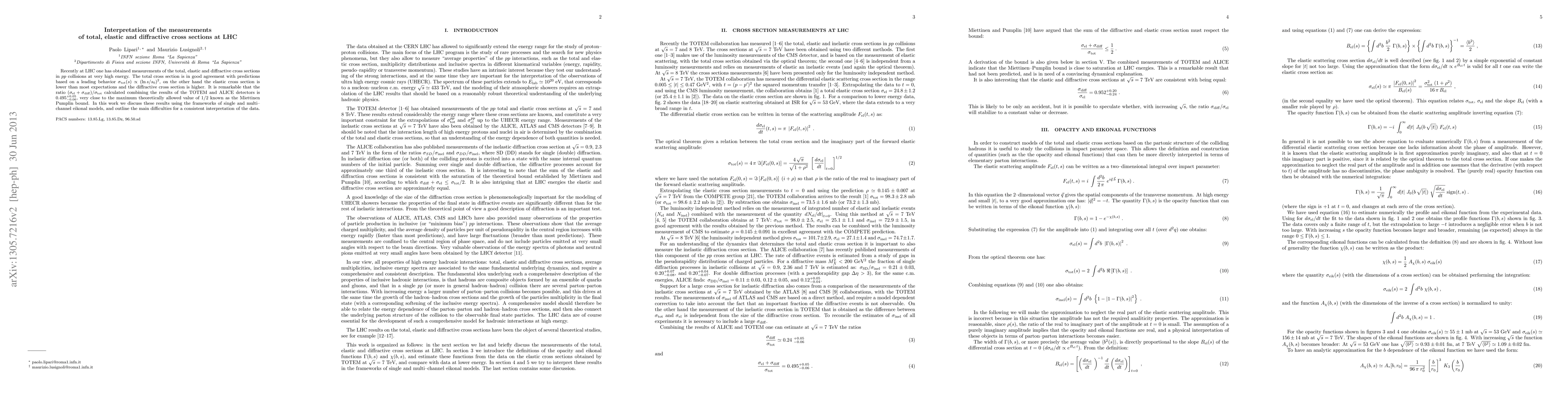 Recently at LHC one has obtained measurements of the total, elastic and diffractive cross sections in pp collisions at very high energy. The total cross section is in good agreement with predictions based on a leading behavior \sigma_{tot} (s) \propto (\ln s/s_0)^2, on the other hand the elastic cross section is lower than most expectations and the diffractive cross section is higher. It is remarkable that the ratio (\sigma_{el} + \sigma_{diff})/\sigma_{tot} calculated combining the results of the TOTEM and ALICE detectors is 0.495^{+0.05}_{-0.06}, very close to the maximum theoretically allowed value of 1/2 known as the Miettinen Pumplin bound. In this work we discuss these results using the frameworks of single and multi--channel eikonal models, and outline the main difficulties for a consistent interpretation of the data.