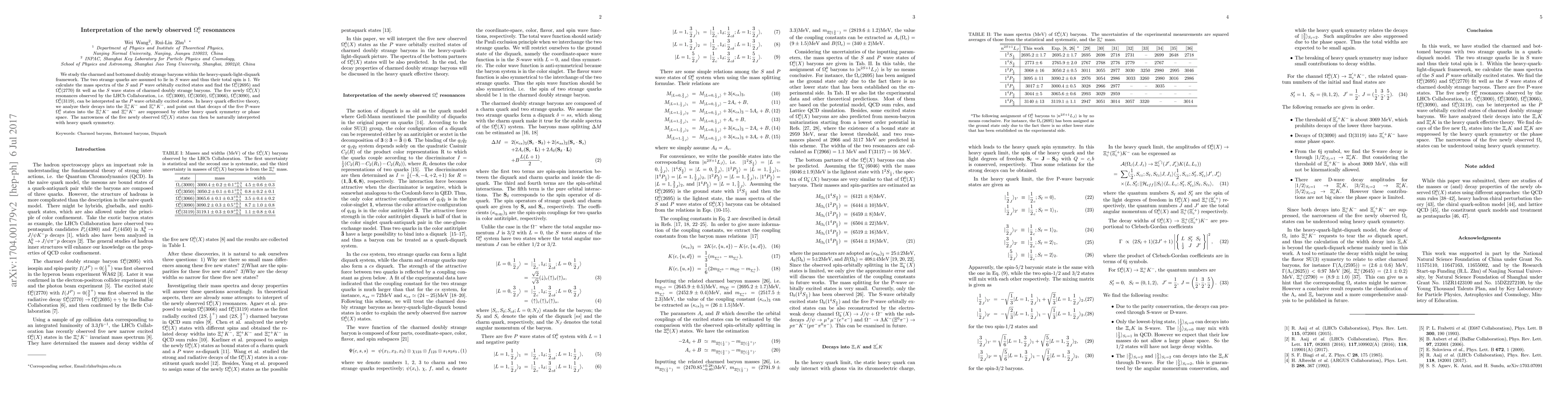We study the charmed and bottomed doubly strange baryons within the heavy-quark-light-diquark framework. The two strange quarks are assumed to lie in $S$ wave and thus their total spin is 1. We calculate the mass spectra of the $S$ and $P$ wave orbitally excited states and find the $\Omega_c^0 (2695)$ and $\Omega_c^0 (2770)$ fit well as the $S$ wave states of charmed doubly strange baryons. The five newly $\Omega_c^0(X)$ resonances observed by the LHCb Collaboration, i.e. $\Omega_c^0(3000)$, $\Omega_c^0(3050)$, $\Omega_c^0(3066)$, $\Omega_c^0(3090)$, and $\Omega_c^0(3119)$, can be interpreted as the $P$ wave orbitally excited states. In heavy quark effective theory, we analyze their decays into the $\Xi^+_c K^-$ and $\Xi_c'^+ K^-$, and point out that decays of the five P-wave $\Omega_c^0$ states into the $\Xi_c^+ K^-$ and $\Xi_c'^+K^-$ are suppressed by either heavy quark symmetry or phase space. The narrowness of the five newly observed $\Omega_c^0(X)$ states can then be naturally interpreted with heavy quark symmetry.