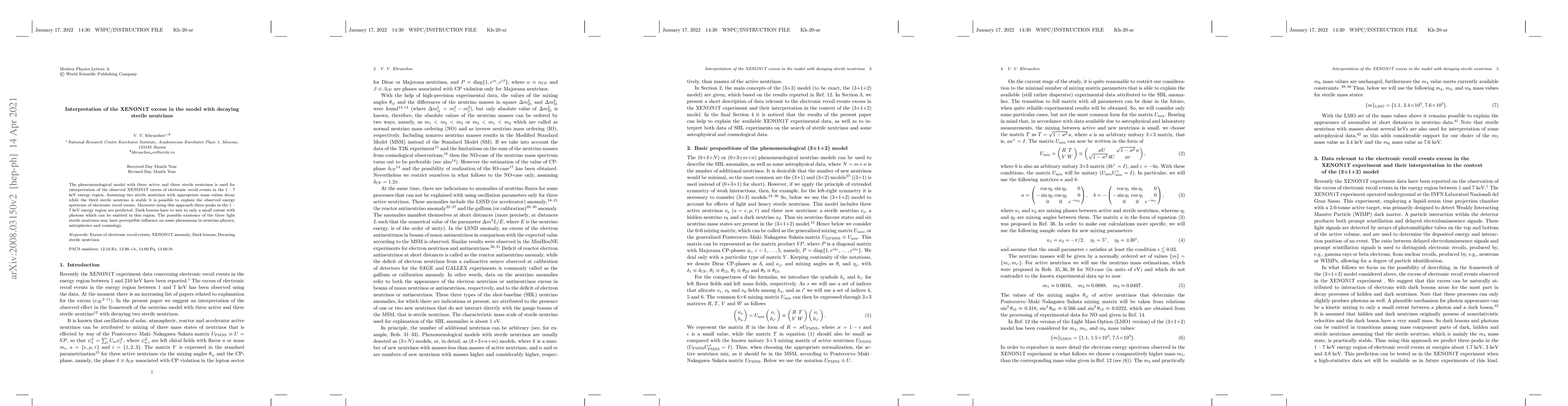 The phenomenological model with three active and three sterile neutrinos is used for interpretation of the observed XENON1T excess of electronic recoil events in the 1 -- 7 keV energy region. Assuming two sterile neutrinos with appropriate mass values decay while the third sterile neutrino is stable it is possible to explain the observed energy spectrum of electronic recoil events. Moreover using this approach three peaks in the 1 -- 7 keV energy region are predicted. Dark bosons have to mix to only a small extent with photons which can be emitted in this region. The possible existence of the three light sterile neutrinos may have perceptible influence on some phenomena in neutrino physics, astrophysics and cosmology.