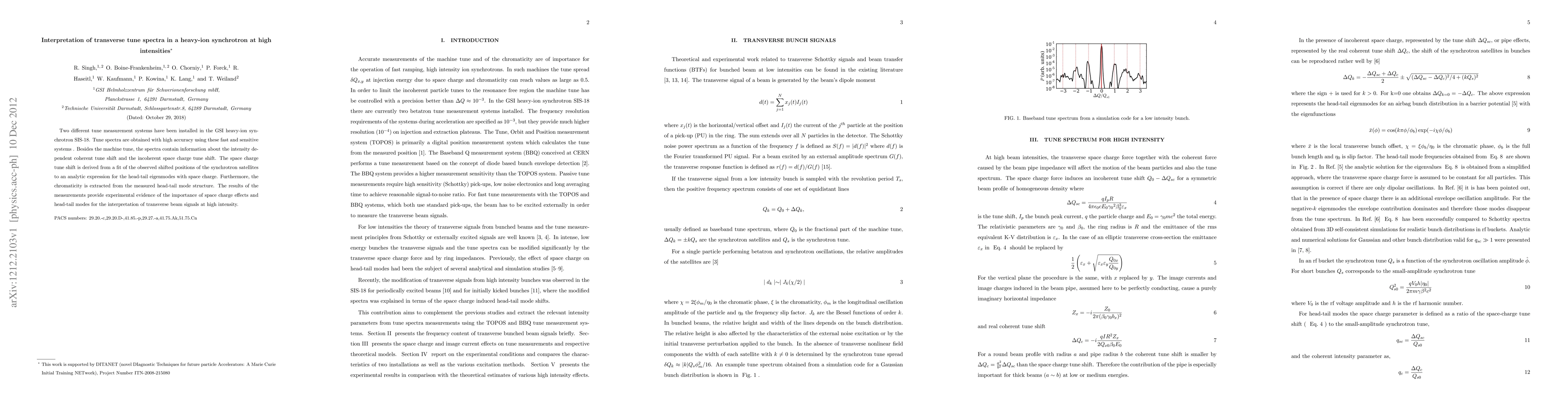 This paper discusses the use of two high-accuracy tune measurement systems in the GSI heavy-ion synchrotron to analyze transverse tune spectra, revealing intensity-dependent coherent and incoherent space charge tune shifts. The study provides experimental evidence for the significance of space charge effects and head-tail modes in interpreting transverse beam signals at high intensities.