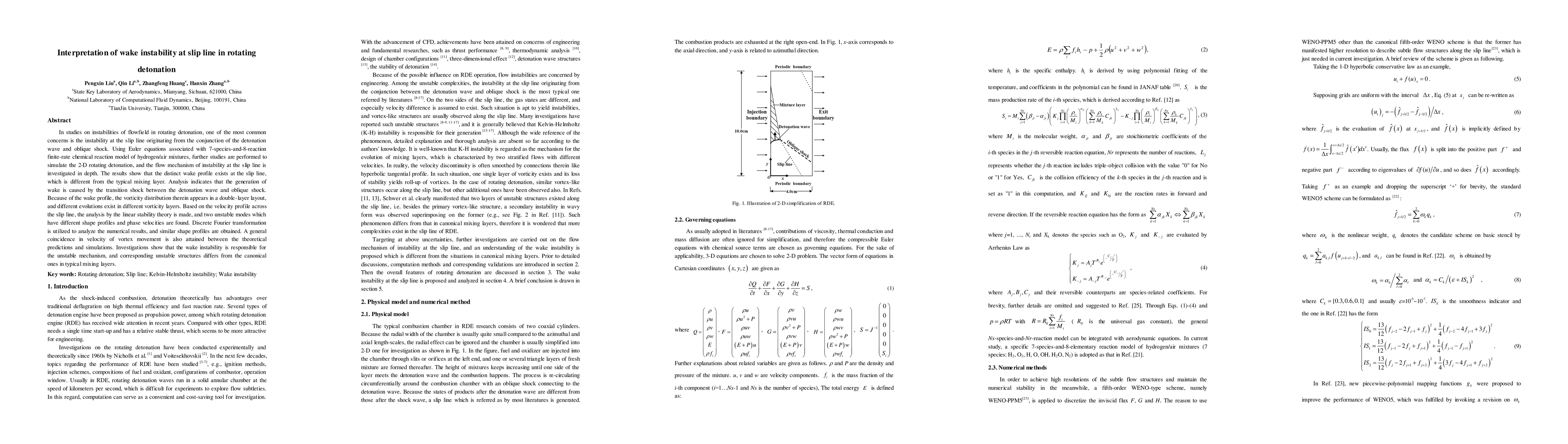 In studies on instabilities of flowfield in rotating detonation, one of the most common concerns is the instability at the slip line originating from the conjunction of the detonation wave and oblique shock. Using Euler equations associated with 7-species-and-8-reaction finite-rate chemical reaction model of hydrogen/air mixtures, further studies are performed to simulate the 2-D rotating detonation, and the flow mechanism of instability at the slip line is investigated in depth. The results show that the distinct wake profile exists at the slip line, which is different from the typical mixing layer. Analysis indicates that the generation of wake is caused by the transition shock between the detonation wave and oblique shock. Because of the wake profile, the vorticity distribution therein appears in a double-layer layout, and different evolution exist in different vorticity layers. Based on the velocity profile across the slip line, the analysis by the linear stability theory is made, and two unstable modes which have different shape profiles and phase velocities are found. Discrete Fourier transformation is utilized to analyze the numerical results, and similar shape profiles are obtained. A general coincidence in velocity of vortex movement is also attained between the theoretical predictions and simulations. Investigations show that the wake instability is responsible for the unstable mechanism, and corresponding unstable structures differs from the canonical ones in typical mixing layers.