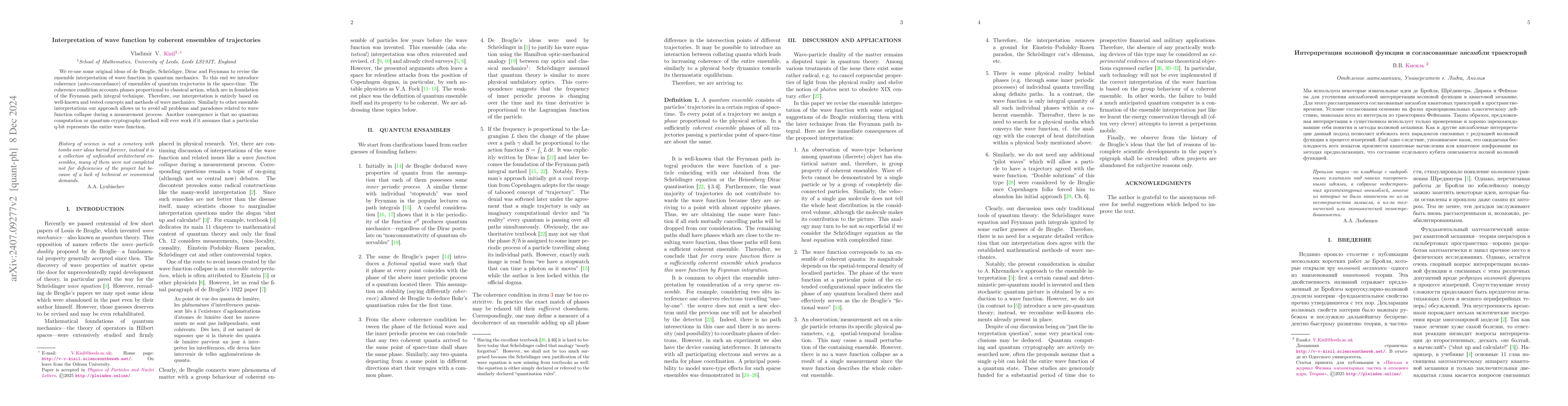 This paper revisits the ensemble interpretation of quantum mechanics, leveraging concepts from de Broglie, Schrödinger, Dirac, and Feynman to define coherence among quantum trajectories. It avoids wave function collapse issues and suggests that quantum computation and cryptography fail if they treat a q-bit as a full wave function.