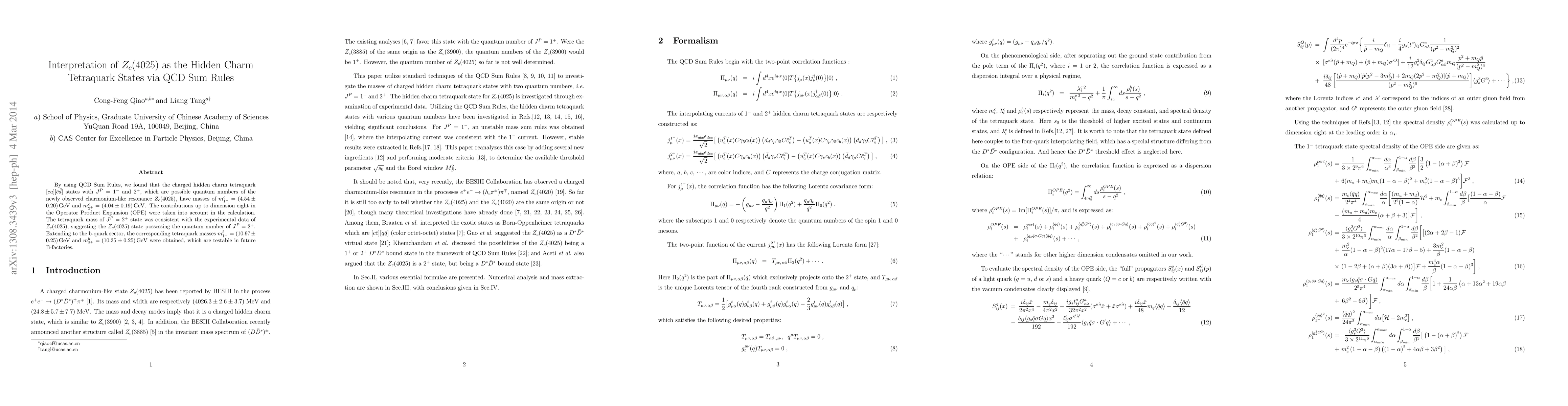 By using QCD Sum Rules, we found that the charged hidden charm tetraquark $[c u][\bar{c} \bar{d}]$ states with $ J^P = 1^-$ and $ 2^+$, which are possible quantum numbers of the newly observed charmonium-like resonance $Z_c(4025)$, have masses of $m_{1^-}^c = (4.54 \pm 0.20) \, \text{GeV}$ and $m_{2^+}^c = (4.04 \pm 0.19) \, \text{GeV}$. The contributions up to dimension eight in the Operator Product Expansion (OPE) were taken into account in the calculation. The tetraquark mass of $J^{P} = 2^{+}$ state was consistent with the experimental data of $Z_c(4025)$, suggesting the $Z_c(4025)$ state possessing the quantum number of $J^P = 2^+$. Extending to the b-quark sector, the corresponding tetraquark masses $m_{1^-}^b = (10.97 \pm 0.25) \, \text{GeV}$ and $m_{2^+}^b = (10.35 \pm 0.25) \, \text{GeV}$ were obtained, which are testable in future B-factories.